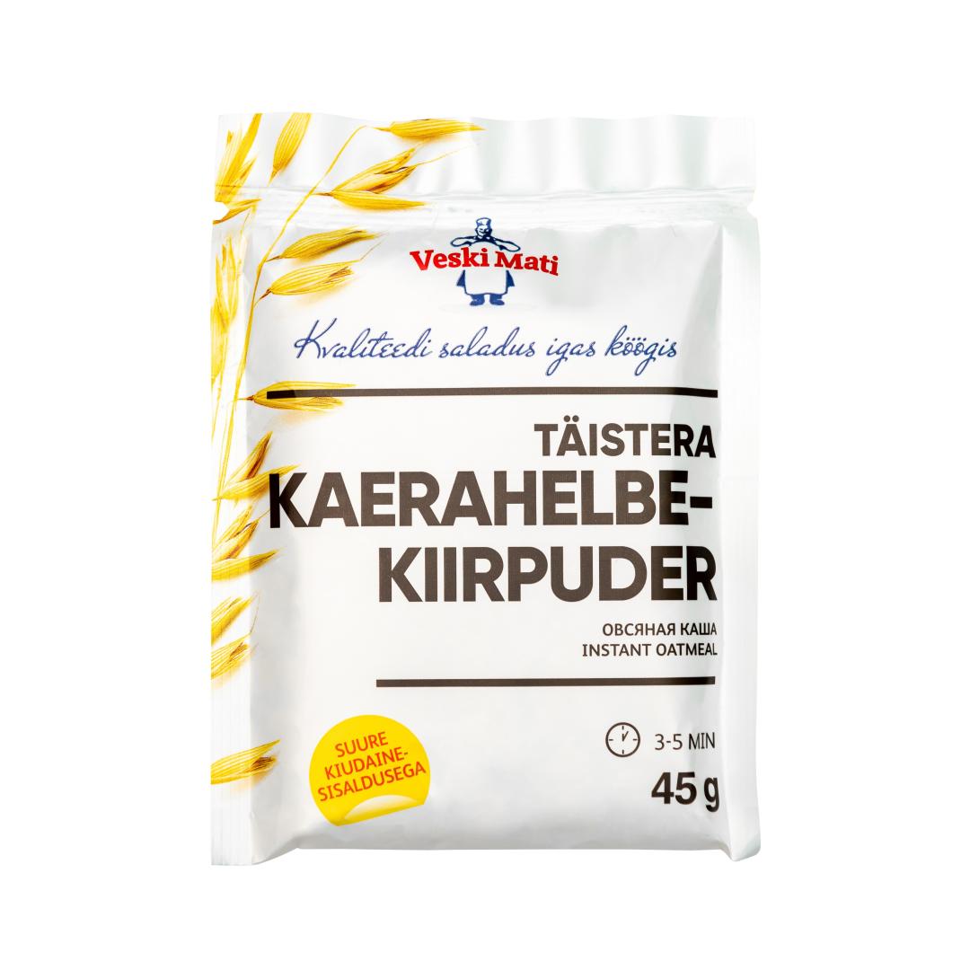80% täistera KAERAHELBED (EU), suhkur, sool. Võib sisaldada PIIMA osakesi. Valmistamisõpetus: vala paki sisu kaussi ja kalla peale 150ml kuuma vett või piima. Sega hästi läbi ja kata kauss kaanega. Lase seista 3-5 min.