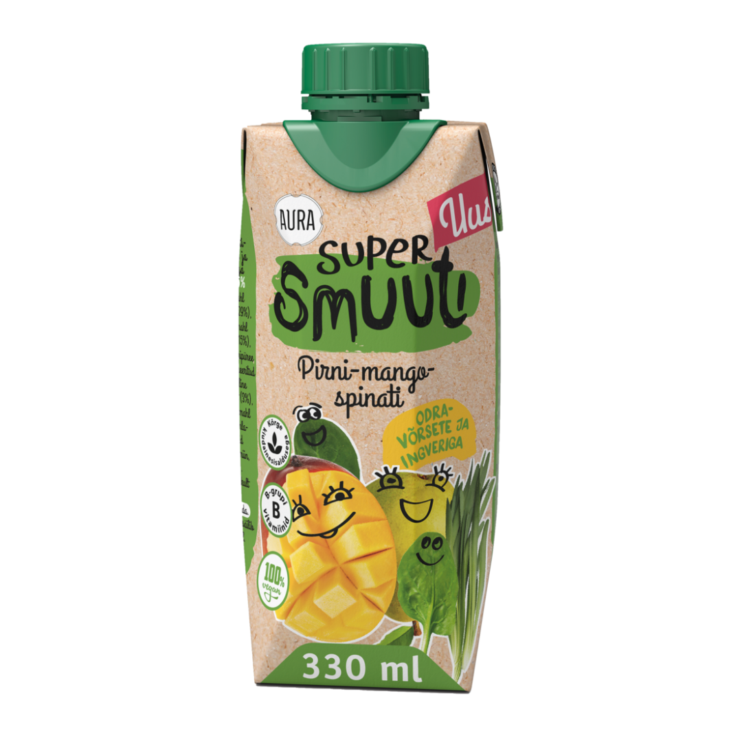 Pirni-mango-spinati supersmuuti odravõrsete ja ingveriga. Koostis: õunamahl kontsentreeritud mahlast (29%), pirnipüree (22%), pirnimahl kontsentreeritud mahlast (15%), mangopüree (14%), banaanipüree (8%), spinatimahl kontsentreeritud mahlast (4%), odravõrsemahl ekstraktist (3%), maisikiud (1,6%), ingverimahl (0,7%), vesi, sidrunimahlakontsentraat, vitamiinid (pantoteenhape, B6-vitamiin, biotiin, B12-vitamiin). Puuviljasisaldus 96% Küpsetest viljadest valmistatud pirni-mango-spinatismuutijook ingveri ja odravõrsemahlaga on kõrge kiudainesisaldusega ning sisaldab B-grupi vitamiine. Pirni ja mango magusat ning mahlast duetti saadavad tõelised supertoidud: tervislik spinat, särtsu täis ingver ning kasulikest toitainetest pakatav ökoloogiline odravõrsemahl. Mõnusale smuutijoogile ei ole lisatud säilitusaineid ega suhkrut ja see on 100% vegantoode. Suurepärane valik kosutavaks hommikusöögiks või värskendavaks vahepalaks! Aura Supersmuuti on valmistatud ainult täiuslikult küpsenud puuviljadest ja sinna ei ole lisatud suhkrut ega säilitusaineid.