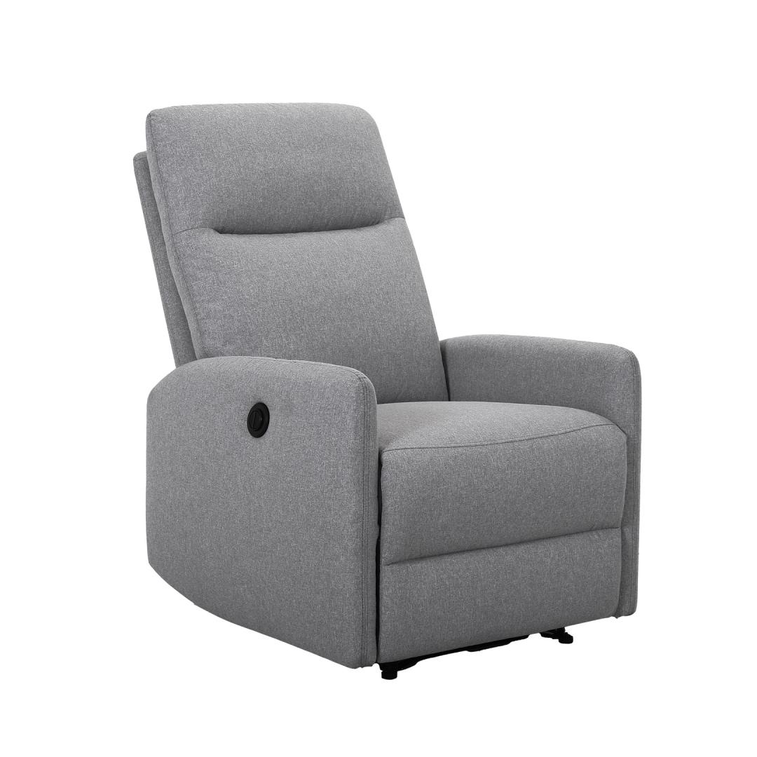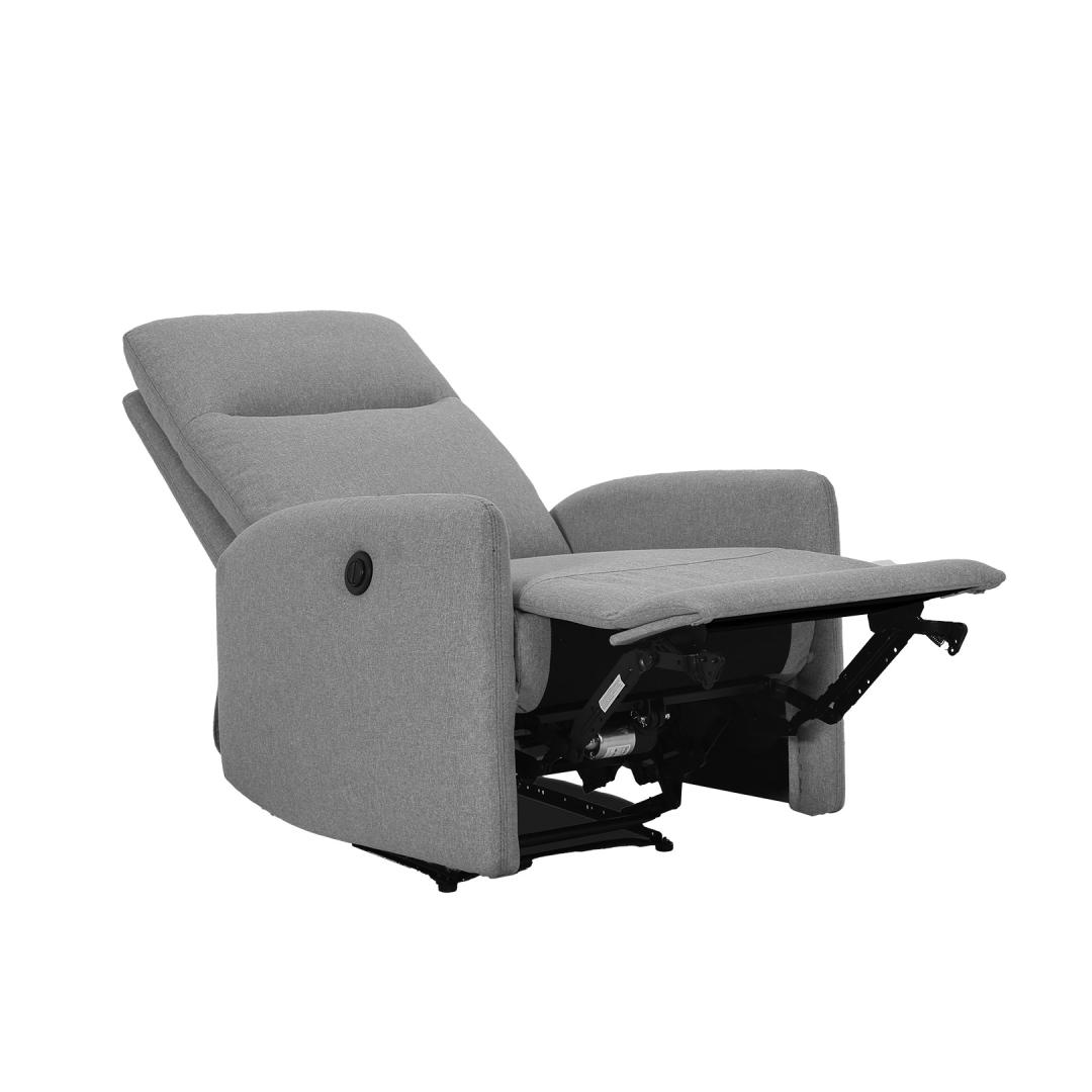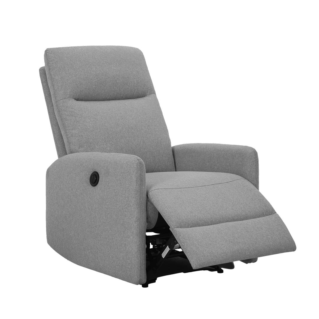 Recliner armchair KATY with electric mechanism, light grey. The position of the footrest can be changed by an electric mechanism. When the footrest is raised, the backrest moves smoothly along. Cover material: 100% polyester fabric. Frame and suspension: plywood, wood, metal. Pocket springs. Upholstery: polyurethane foam 20-28kg/m³. The overall dimensions of the armchair are 78x97xH110cm. Seat width 55cm, seat depth 55cm, seat height 50cm. Tugitool KATY elektriline recliner, helehall. Recliner tüüpi tugitooli jalatoe asendit on võimalik muuta elektrilise mehhanismi abil. Jalatuge üles tõstes liigub seljatugi sujuvalt kaasa. Kattematerjal: 100% polüesterkangas. Karkass ja vedrustus: puit, vineer ja metall. Pocket vedrud. Polsterdus: polüuretaanvaht 20-28kg/m³. Tugitooli üldmõõdud on 78x97xH110cm. Istme laius 55cm, istme sügavus 55cm, istme kõrgus 50cm.