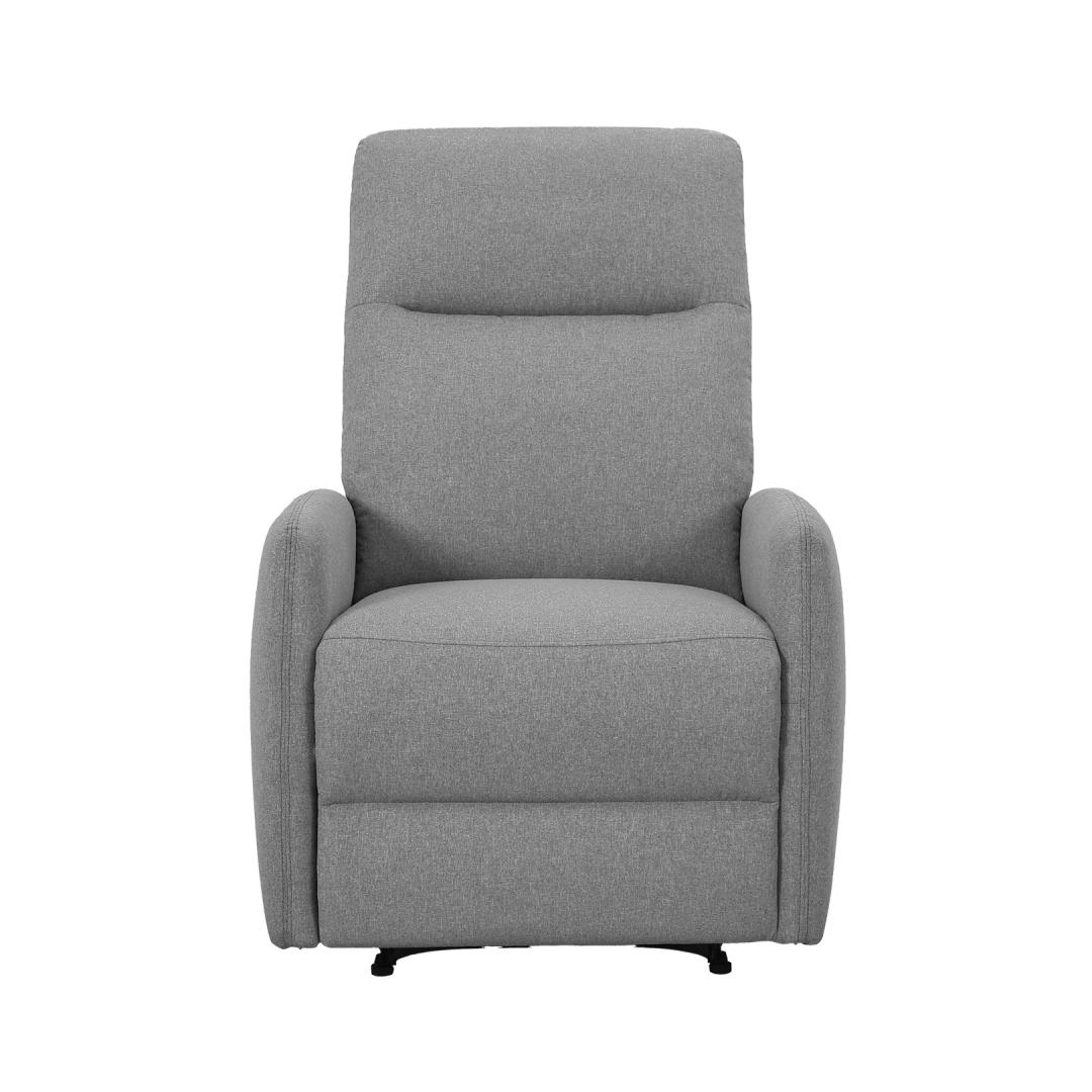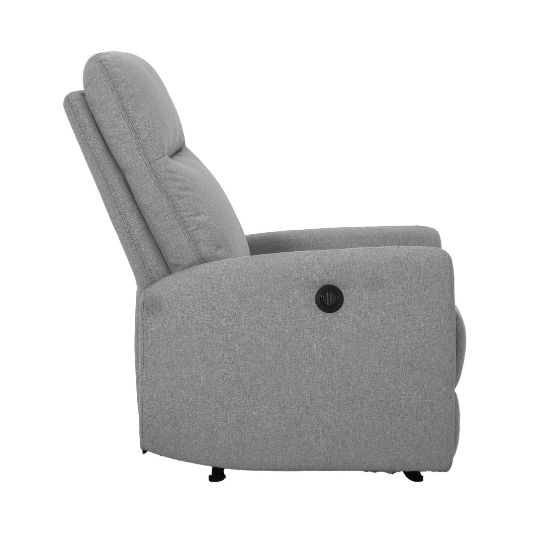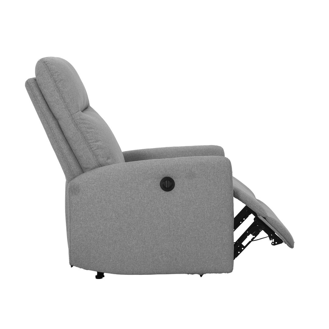 Recliner armchair KATY with electric mechanism, light grey. The position of the footrest can be changed by an electric mechanism. When the footrest is raised, the backrest moves smoothly along. Cover material: 100% polyester fabric. Frame and suspension: plywood, wood, metal. Pocket springs. Upholstery: polyurethane foam 20-28kg/m³. The overall dimensions of the armchair are 78x97xH110cm. Seat width 55cm, seat depth 55cm, seat height 50cm. Tugitool KATY elektriline recliner, helehall. Recliner tüüpi tugitooli jalatoe asendit on võimalik muuta elektrilise mehhanismi abil. Jalatuge üles tõstes liigub seljatugi sujuvalt kaasa. Kattematerjal: 100% polüesterkangas. Karkass ja vedrustus: puit, vineer ja metall. Pocket vedrud. Polsterdus: polüuretaanvaht 20-28kg/m³. Tugitooli üldmõõdud on 78x97xH110cm. Istme laius 55cm, istme sügavus 55cm, istme kõrgus 50cm.