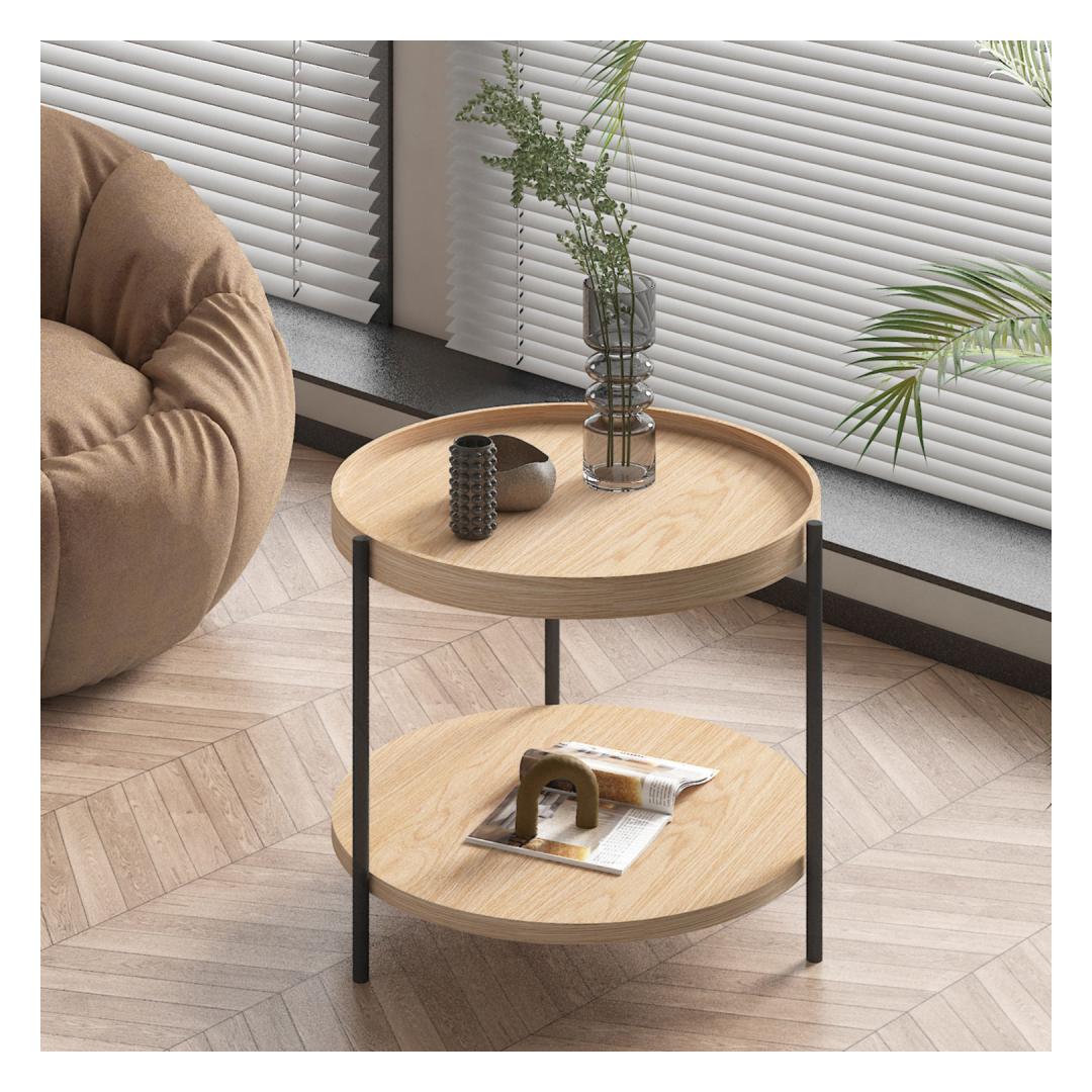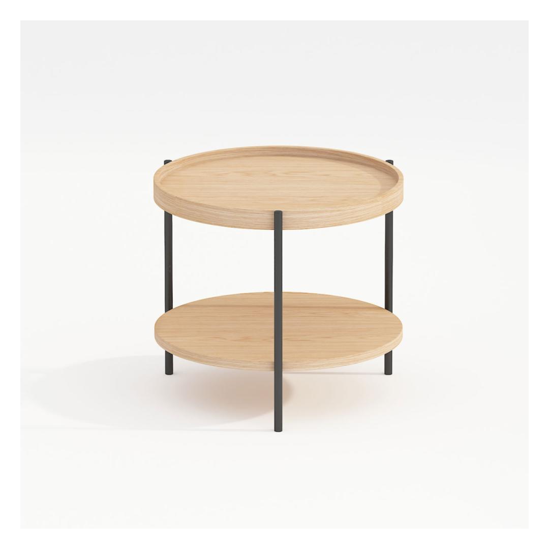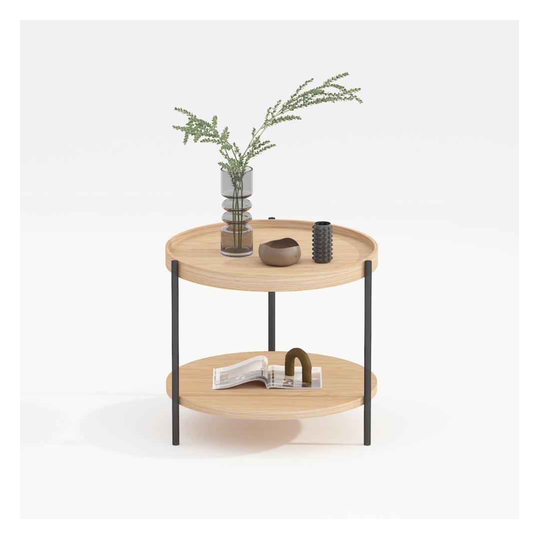 Coffee table CINDY D50xH45cm, melamine oak. The tabletop and lower shelf are made of melamine board with light oak decor. The legs and frame of the table are made of metal and finished with a black powder coating. Diivanilaud CINDY D50xH45cm, melamiin tamm. Lauaplaat ja alumine riiul on valmistatud heleda tammedekooriga melamiinplaadist. Laua jalad ja raam on valmistatud metallist ja viimistletud musta pulbervärviga.