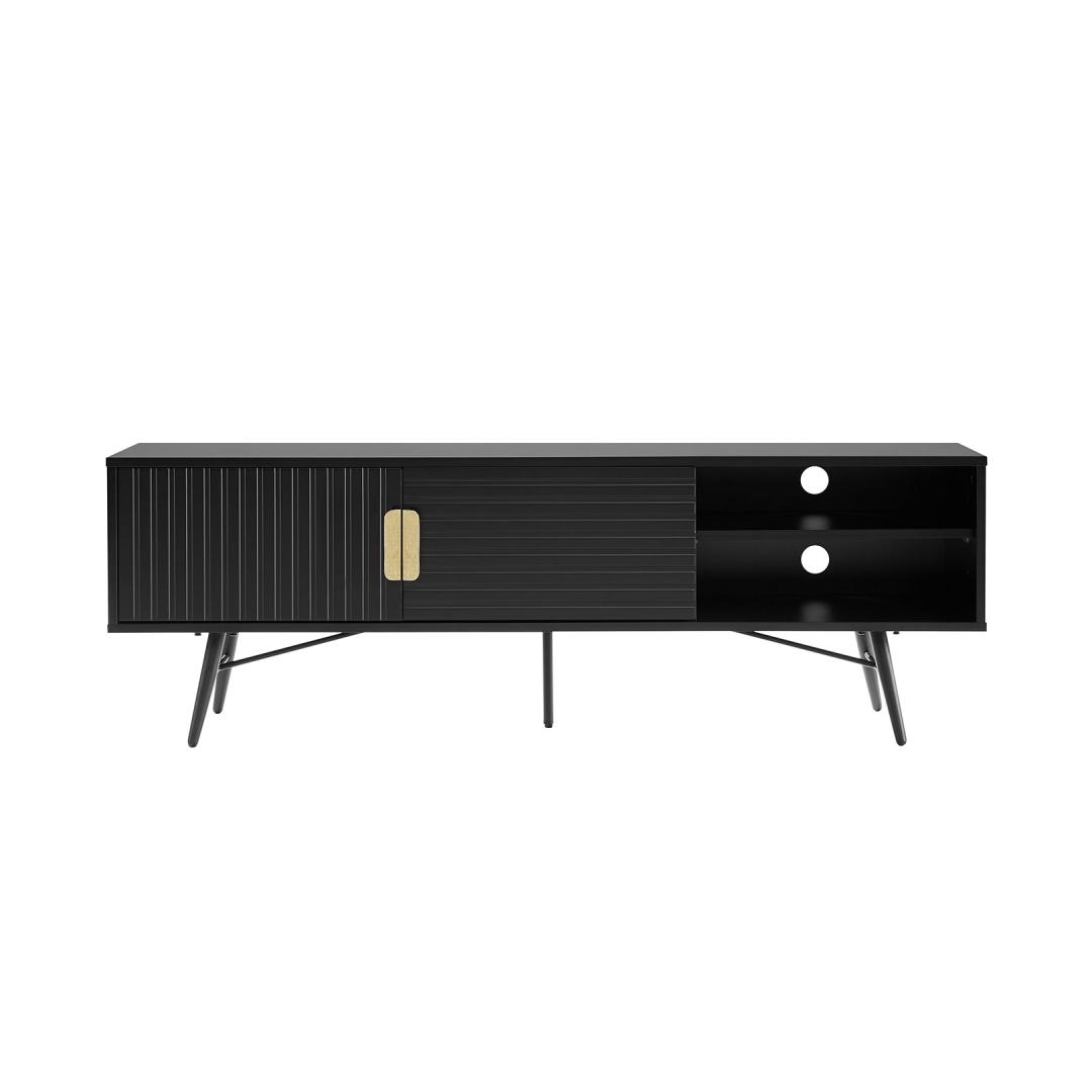 TV laud PIXAR 150x40xH50cm, must. Mööbliplaadist valmistatud TV laud on viimistletud musta polüuretaanvärviga. Ribipaneelist uksed ja kuldsed käepidemed annavad lauale pilkupüüdva välimuse. TV laua jalad ja alusraam on valmistatud metallist. TV laud PIXAR 150x40xH50cm, must. Mööbliplaadist valmistatud TV laud on viimistletud musta polüuretaanvärviga. Ribipaneelist uksed ja kuldsed käepidemed annavad lauale pilkupüüdva välimuse. TV laua jalad ja alusraam on valmistatud metallist.