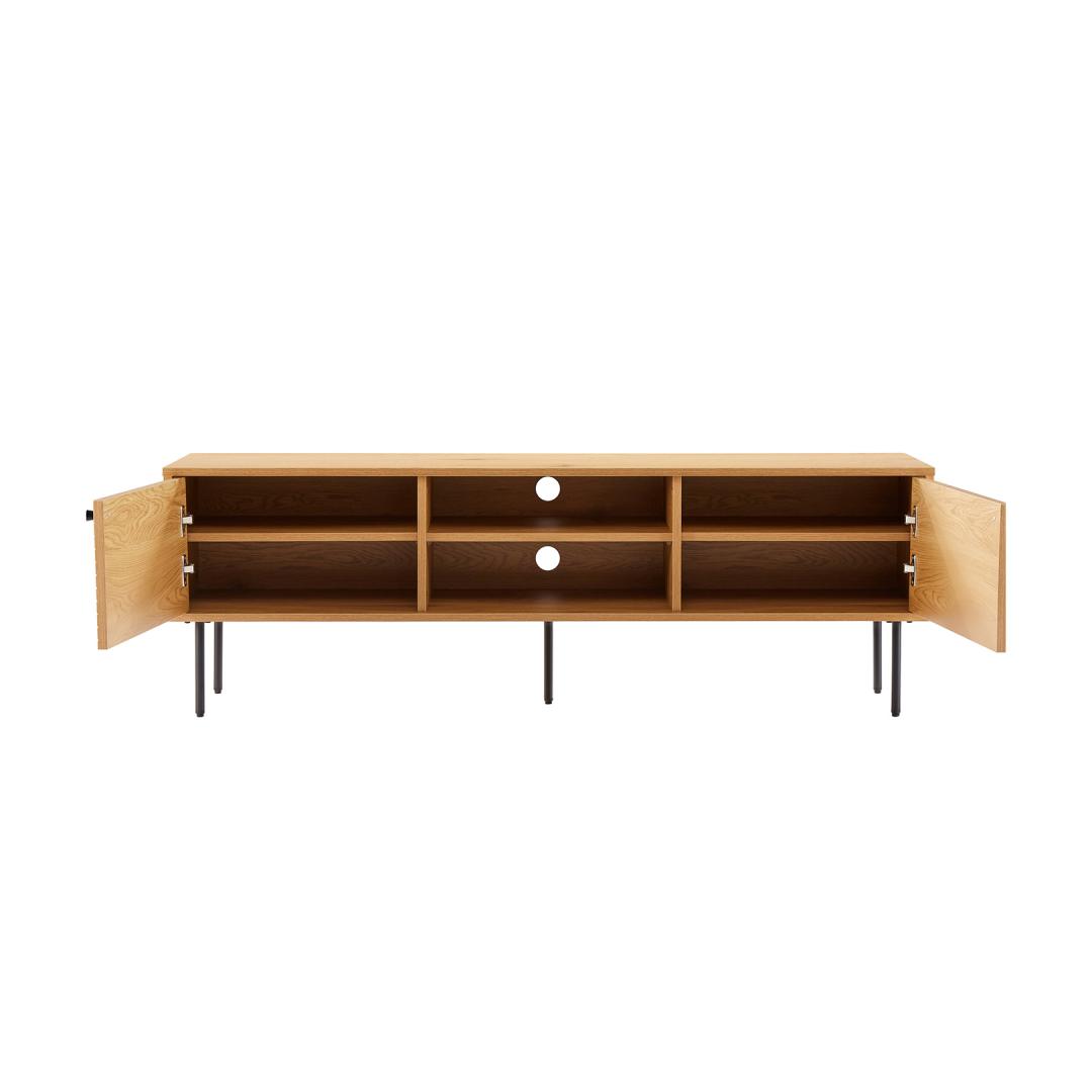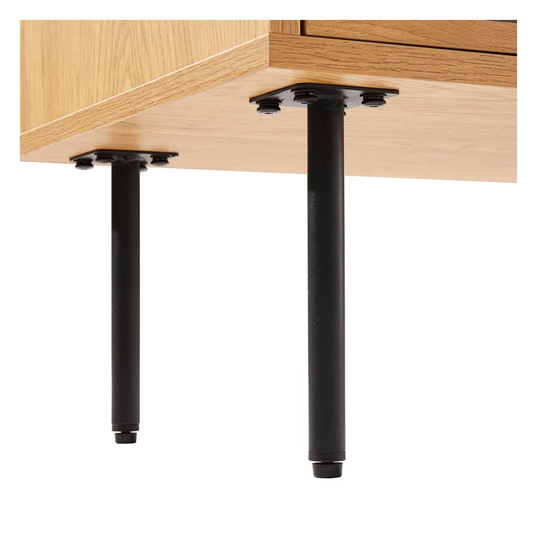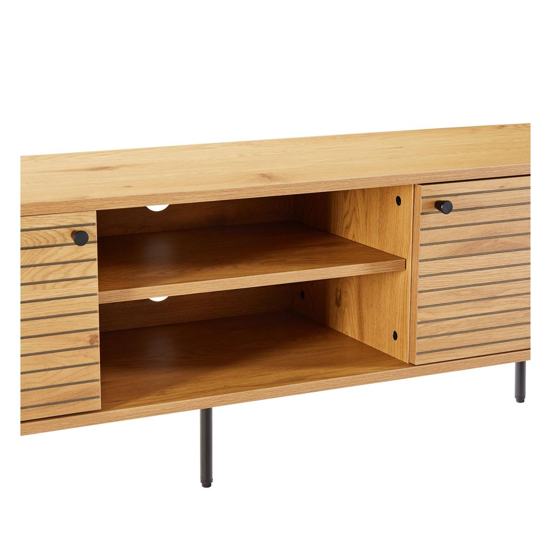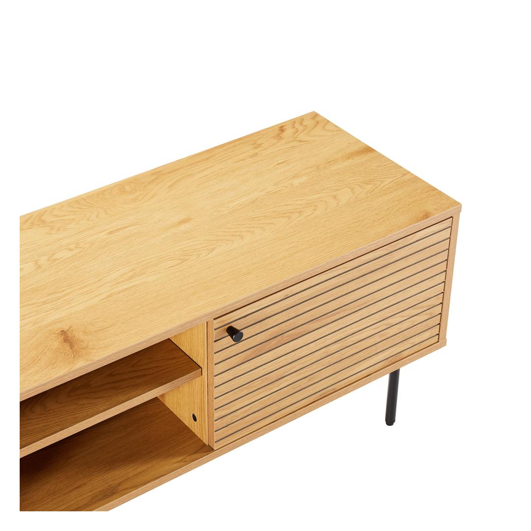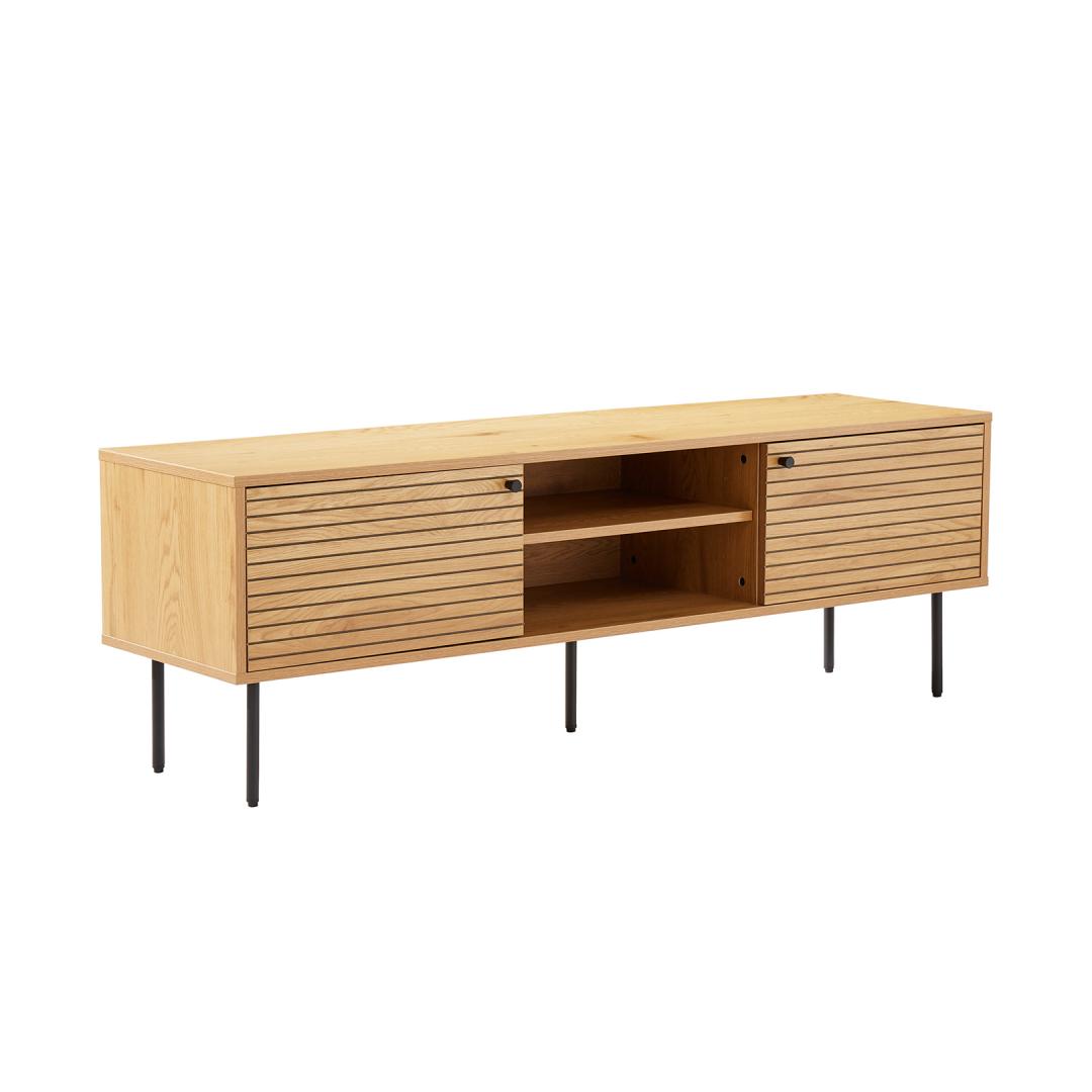 TV table LINE with 2-doors and shelves 150x40xH50cm. The sideboard is made of melamine board with oak bark. The striped door panels with an embossed surface are made of black MDF board, and decorated with narrow oak-colored slats. The metal legs of the sideboard are finished with a black powder coating. TV laud LINE 2-ukse ja riiulitega 150x40xH50cm. TV laud on valmistatud tammedekooriga melamiinplaadist. Efektsed reljeefse pinnaga triibulised uksed on valmistatud mustast MDF plaadist, mida kaunistavad tammevärvi kitsad liistud. TV laua metallist jalad on viimistletud musta pulbervärviga.