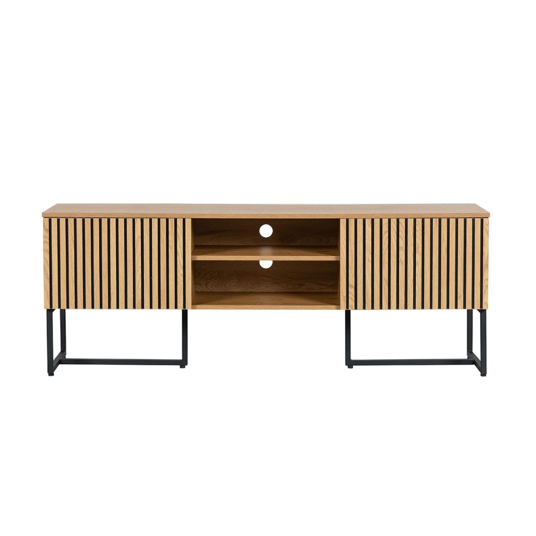 TV table HAMPTON with 2 doors and 2 open shelves 160x40xH60cm. The tabletop and body are made of melamine board with oak bark. The door panels are decorated with narrow oak-colored MDF slats on a black background. The metal base frame of the table is finished with a black powder coating. TV laud HAMPTON 2-ukse ja 2-avatud riiuliga 160x40xH60cm. Lauaplaat ja korpus on valmistatud tammedekooriga melamiinplaadist. Uksepaneele kaunistavad kitsad tammevärvi MDF liistud mustal taustal. Laua metallist alusraam on viimistletud musta pulbervärviga.
