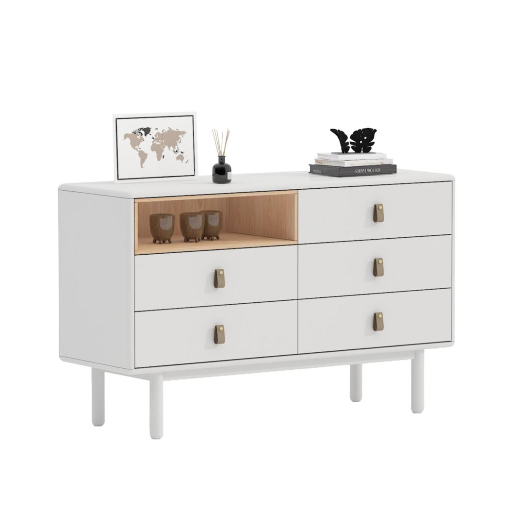 Kummut IRIS 5-sahtli ja riiuliga 120x40xH75cm, valge. Kummut on valmistatud 18mm MDF plaadist. Jalad ja alusraam on valmistatud täispuidust. Kummut on viimistletud vastupidava polüuretaanvärviga. Sahtlitel on nahast käepidemed. Avatud vaheriiul on vooderdatud heleda puiduvärvi plaadiga. Kummutil on ümarad välisservad. Kummut IRIS 5-sahtli ja riiuliga 120x40xH75cm, valge. Kummut on valmistatud 18mm MDF plaadist. Jalad ja alusraam on valmistatud täispuidust. Kummut on viimistletud vastupidava polüuretaanvärviga. Sahtlitel on nahast käepidemed. Avatud vaheriiul on vooderdatud heleda puiduvärvi plaadiga. Kummutil on ümarad välisservad.