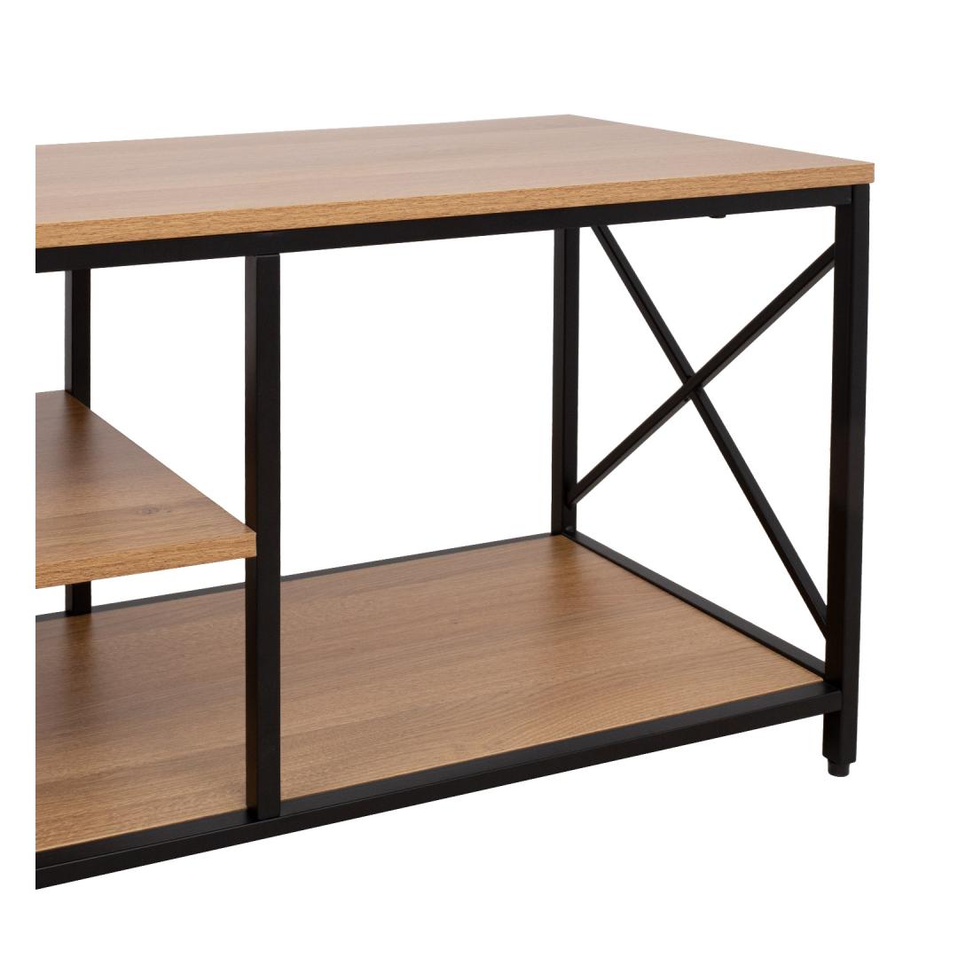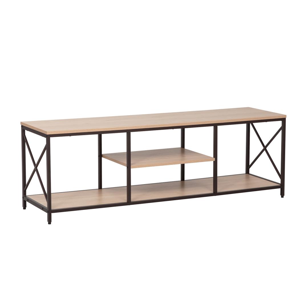 TV table STUDY 140x40xH46,5cm, oak/black. Top plate and shelves: melamine plate with oak decor. The frame is made of metal and finished with a black powder coating. TV laud STUDY 140x40xH46,5cm, tamm/must. Pealmine plaat ja riiulid: tamme dekooriga melamiinplaat. Raam on valmistatud metallist ja viimistletud musta pulbervärviga.