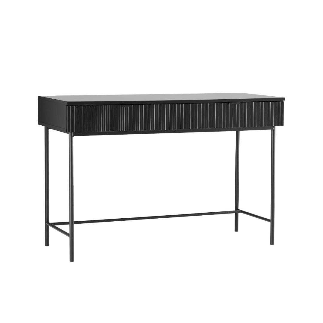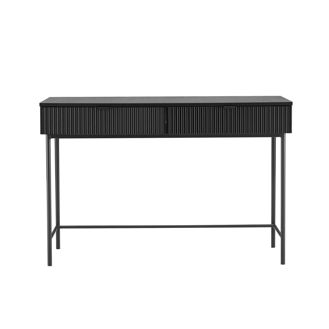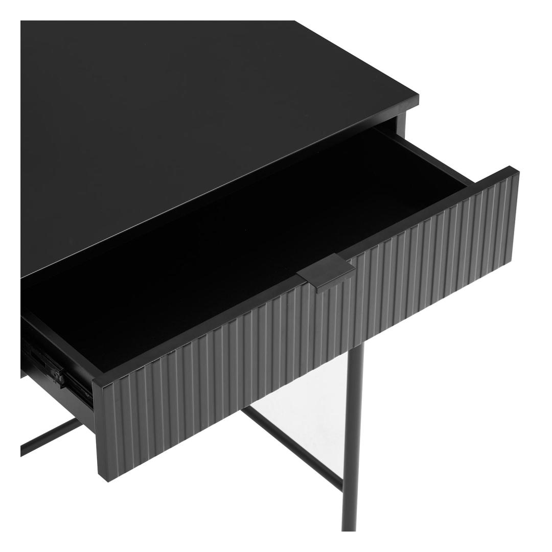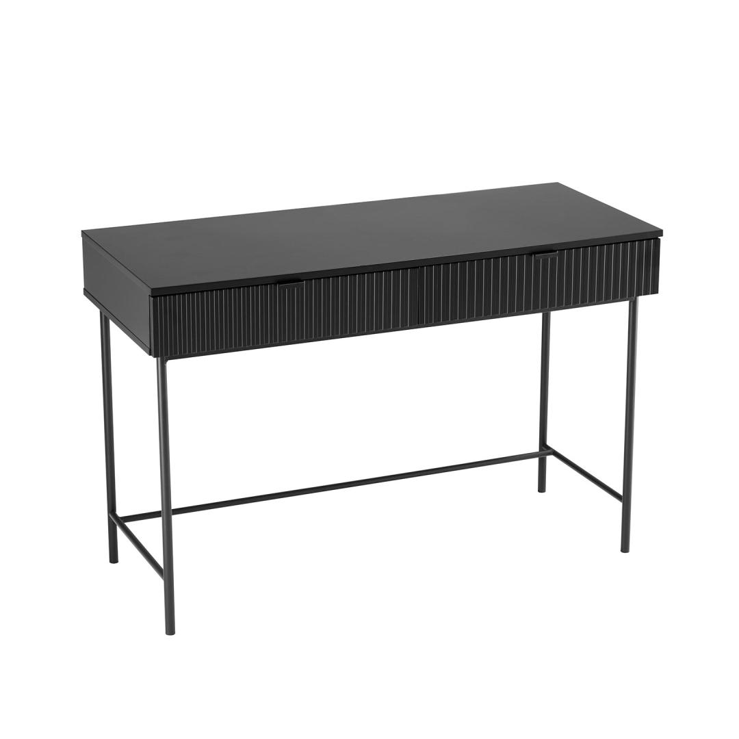 Desk SEQUENCE 120x50xH79cm, black. The tabletop and body are made of furniture board. Drawer fronts: decorative ribbed MDF panel. The table is finished with durable polyurethane paint. The table legs and base frame are made of metal and powder-coated. Kirjutuslaud SEQUENCE 120x50xH79cm, must. Lauaplaat ja korpus on valmistatud mööbliplaadist. Sahtlite esiküljed: dekoratiivne MDF ribiplaat. Laud on viimistletud vastupidava polüuretaanvärviga. Laua jalad ja alusraam on valmistatud metallist ja kaetud pulbervärviga.