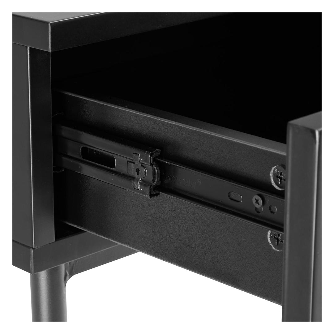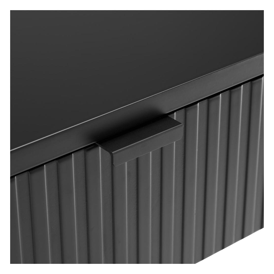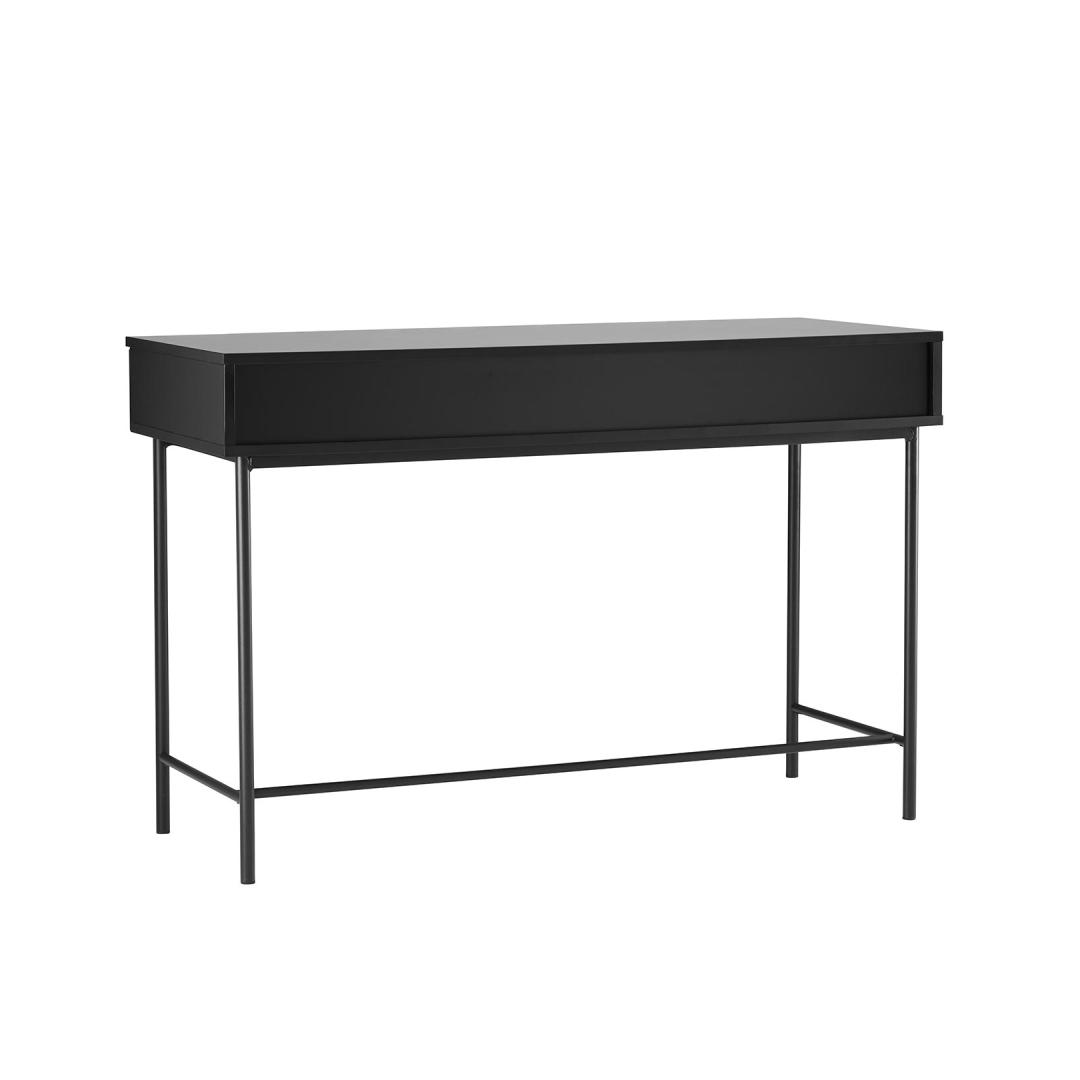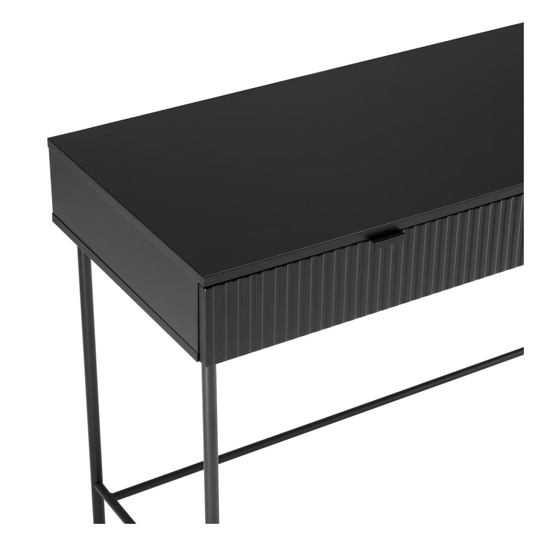 Desk SEQUENCE 120x50xH79cm, black. The tabletop and body are made of furniture board. Drawer fronts: decorative ribbed MDF panel. The table is finished with durable polyurethane paint. The table legs and base frame are made of metal and powder-coated. Kirjutuslaud SEQUENCE 120x50xH79cm, must. Lauaplaat ja korpus on valmistatud mööbliplaadist. Sahtlite esiküljed: dekoratiivne MDF ribiplaat. Laud on viimistletud vastupidava polüuretaanvärviga. Laua jalad ja alusraam on valmistatud metallist ja kaetud pulbervärviga.