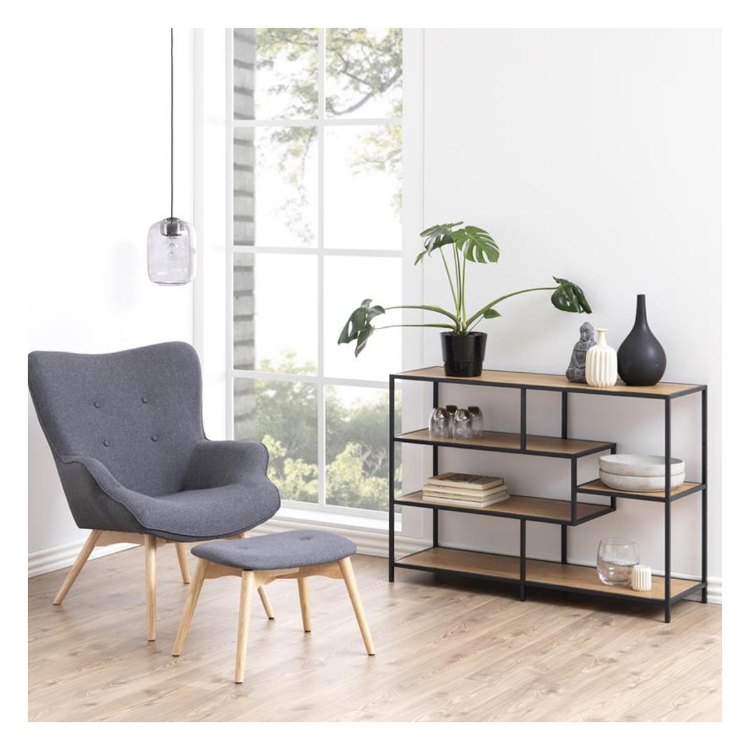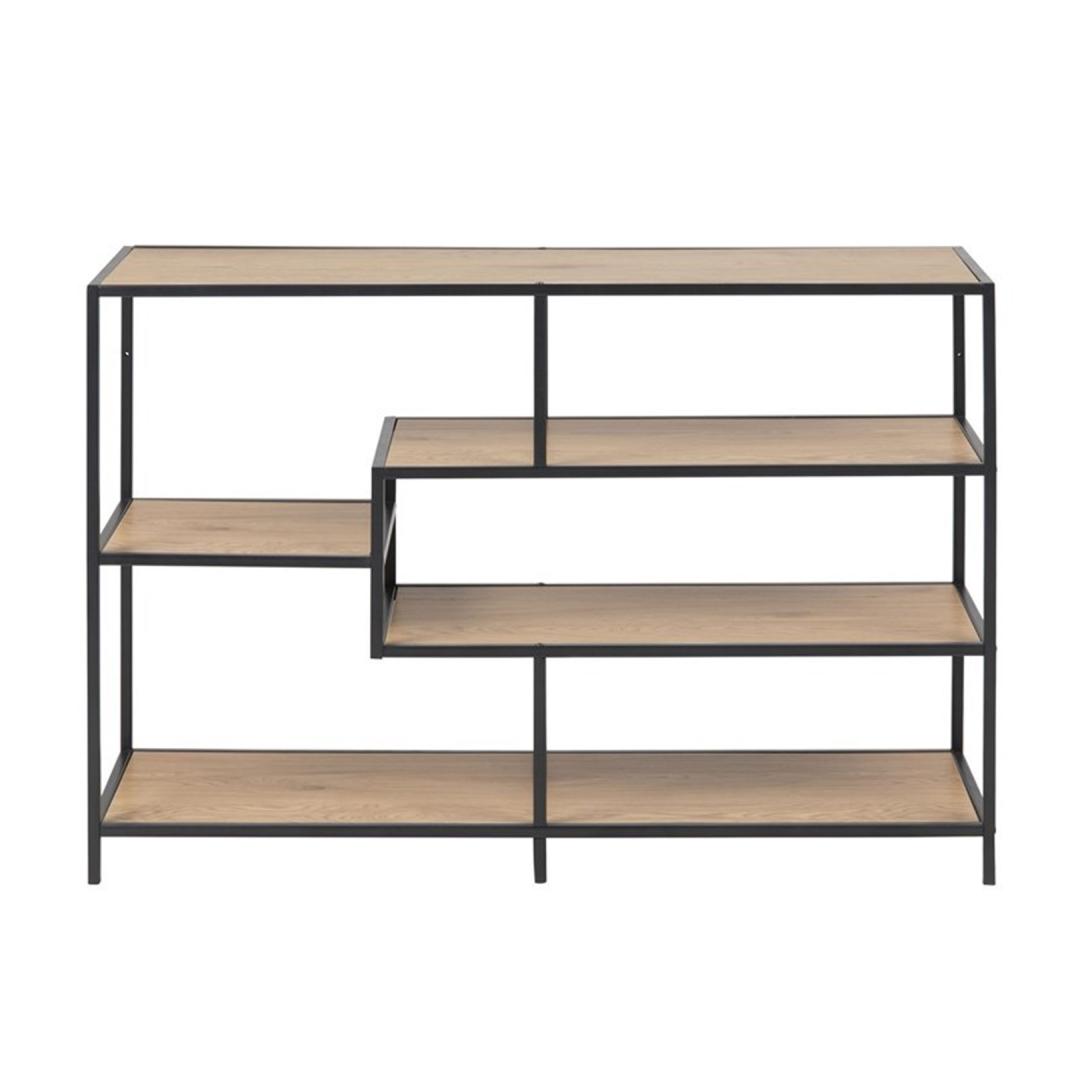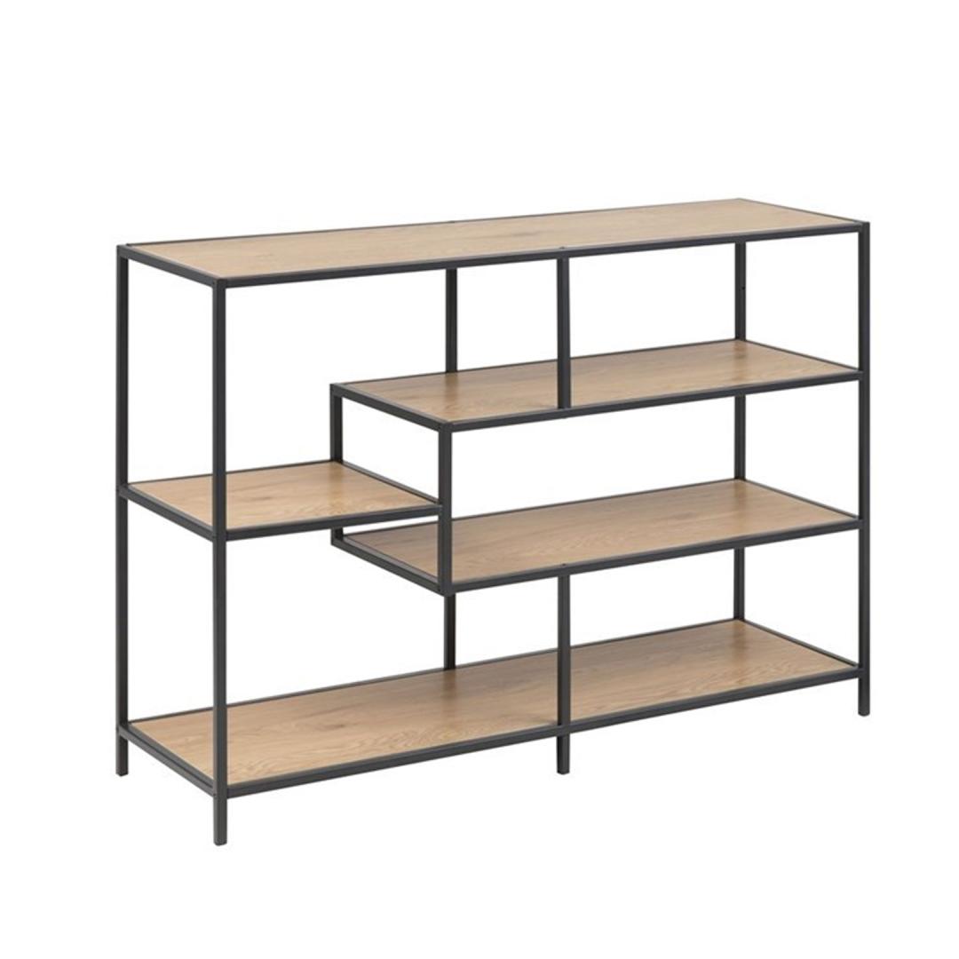 Shelf SEAFORD 114x35xH78cm, oak. The tasteful and practical shelf can be used in various rooms for convenient storage. The shelves are made of laminated particle board. The color is oak. The frame is made of black metal. The dimensions of the product are 114x35xH78cm. Riiul SEAFORD 114x35xH78cm, tamm. Maitsekat ja praktilist riiulit on võimalik kasutada erinevates ruumides asjade mugavaks hoiustamiseks. Riiulid on valmistatud lamineeritud kattega mööbliplaadist. Värvus on tamm. Raam on valmistatud musta värvi metallist. Toote mõõdud on 114x35xH78cm.