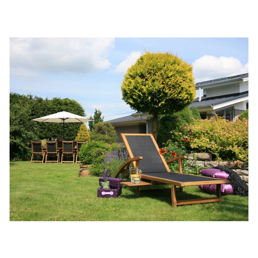 Deck chair FUTURE 75x198xH52cm, black. Deck chair makes enjoying sunny weather more relaxing. The chair has a tray attached to it, where you may conveniently place a glass or other necessities. The frame of the chair is made of acacia wood and finished with wood preservative oil in the color of teak. Textilene seat of the chair is well-ventilated, dries quickly, and is easy to clean. The backrest of the recliner is adjustable in five positions. The auxiliary table under the recliner can be pulled out to the left or right. The dimensions of the table are 30x28cm. Seat width 60cm, seat length 113cm, seat height 30cm. Backrest width 50cm, backrest length 82cm. Weight limit 100kg. CARE: wood is a living product that changes and ages over time. Clean the furniture regularly, protect it from excess moisture and UV radiation. A light sanding and a new oil layer at least once a year is sufficient to give the furniture a fresh look again. STORAGE: at the end of the summer season, we recommend to store the garden furniture indoors. Clean and dry the furniture before storing it. Use a dry, well-ventilated room for storage. Protect the furniture from direct sunlight during storage. Lamamistool FUTURE 75x198xH52cm, must. Lamamistooli kasutamine muudab suvepäikese nautimise lõõgastavaks ja mugavaks. Tooli raam on valmistatud akaatsia puidust ja viimistletud tiikpuu toonis puidukaitseõliga. Must textilene iste laseb hästi õhku läbi ja kuivavad kiiresti ja on lihtsalt hooldatav. Lamamistooli seljatugi on reguleeritav viies positsioonis. Lamamistooli alla paigutatud abilaua võib välja tõmmata vasakule või paremale poole. Laua mõõdud on 30x28cm. Tooli istme laius 60cm, istme pikkus 113cm, istme kõrgus 30cm. Seljatoe laius 50cm, seljatoe pikkus 82cm. Kaalupiirang on 100kg. HOOLDUS: puit on elav looduslik materjal, mille välisilme ilmastikutingimuste mõjul muutub. Puhastage mööblit regulaarselt, kaitske liigniiskuse ja UV kiirguse eest. Kerge lihvimine ja uus õlikiht vähemalt korra aastas on piisav värskenduskuur mööblile jälle uue näo andmiseks. HOIUSTAMINE: suvehooaja lõppedes soovitame aiamööblit hoiustada siseruumides. Puhastage ja kuivatage mööbel enne hoiule panekut. Kasutage hoiustamiseks kuiva ning hea ventilatsiooniga ruumi.