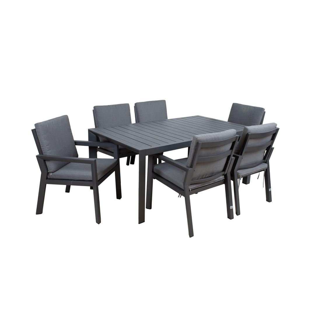 Aiamööblikomplekt TOMSON laud ja 6 tooli. Laua mõõdud on 176x100xH73cm. Lauaplaat ja jalad ning toolide jalad ja raam on valmistatud alumiiniumist ja viimistletud tumehalli pulbervärviga. Toolide istmepadjad kuuluvad komplekti. Padjakatted on valmistatud hallist olefin kangast. Katted on eemaldatavad ja pestavad. Istmepadja mõõdud on 51x54xH5cm, seljatoepadja mõõdud on 51x48x4cm. Tooli üldmõõdud on 61,5x68xH85cm. Istme laius 51cm, istme sügavus 45cm, istme kõrgus koos padjaga 47cm, käetoe kõrgus maast 63,5cm. Kaalupiirang 120kg. Toode on muutlikes ilmastikutingimustes väga hästi vastupidav ja lihtsalt hooldatav. Kaitset ilmastikuolude eest vajavad ainult padjad. HOIUSTAMINE: suvehooaja lõppedes soovitame aiamööblit hoiustada siseruumides. Puhastage ja kuivatage mööbel enne hoiule panekut. Kasutage hoiustamiseks kuiva ning hea ventilatsiooniga ruumi. Aiamööblikomplekt TOMSON laud ja 6 tooli. Laua mõõdud on 176x100xH73cm. Lauaplaat ja jalad ning toolide jalad ja raam on valmistatud alumiiniumist ja viimistletud tumehalli pulbervärviga. Toolide istmepadjad kuuluvad komplekti. Padjakatted on valmistatud hallist olefin kangast. Katted on eemaldatavad ja pestavad. Istmepadja mõõdud on 51x54xH5cm, seljatoepadja mõõdud on 51x48x4cm. Tooli üldmõõdud on 61,5x68xH85cm. Istme laius 51cm, istme sügavus 45cm, istme kõrgus koos padjaga 47cm, käetoe kõrgus maast 63,5cm. Kaalupiirang 120kg. Toode on muutlikes ilmastikutingimustes väga hästi vastupidav ja lihtsalt hooldatav. Kaitset ilmastikuolude eest vajavad ainult padjad. HOIUSTAMINE: suvehooaja lõppedes soovitame aiamööblit hoiustada siseruumides. Puhastage ja kuivatage mööbel enne hoiule panekut. Kasutage hoiustamiseks kuiva ning hea ventilatsiooniga ruumi.
