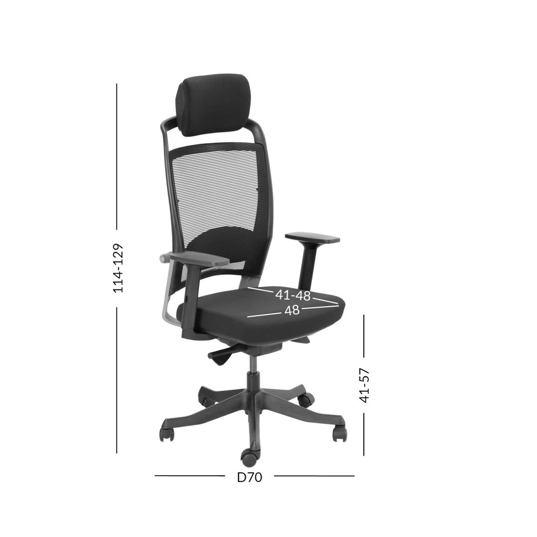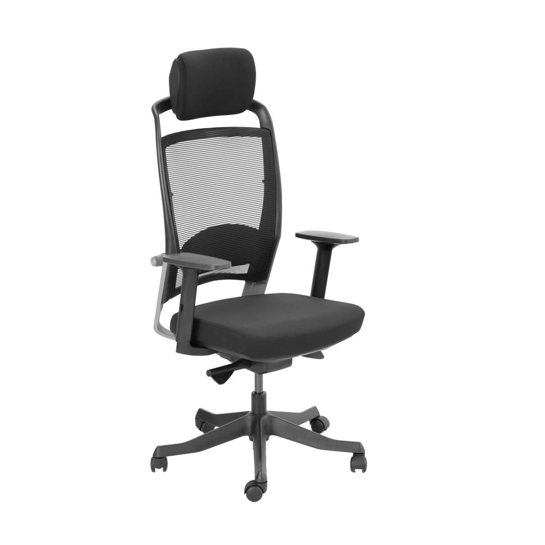 Task chair FULKRUM black. FULKRUM is built to last and allows you to stay focused and efficient throughout the long workday. The elastic mesh back is comfortable and allows improved ventilation. The adjustable lumbar support provides the necessary support for the lower back. The height of the headrest is adjustable by 5cm. The backrest frame and armrests are made of black plastic. The lower part of the frame and the angled parts of the armrests are reinforced with fiber. The upholstered seat and headrest of the chair are covered with black polyester fabric, Martindale value 50,000. The seat depth is adjustable. The weight-sensitive synchronous mechanism self-adjusts recline force to the user’s weight and offers