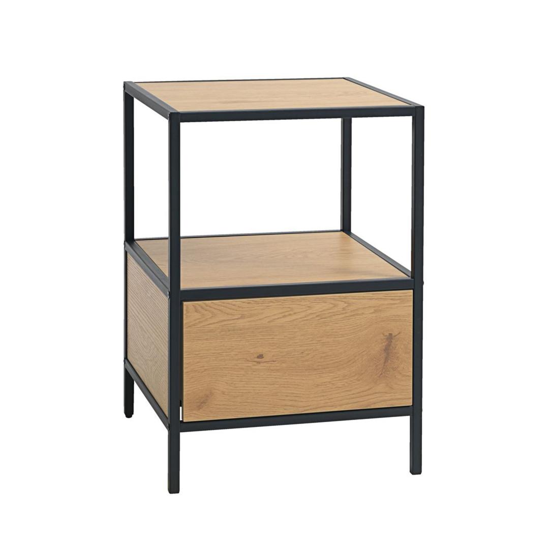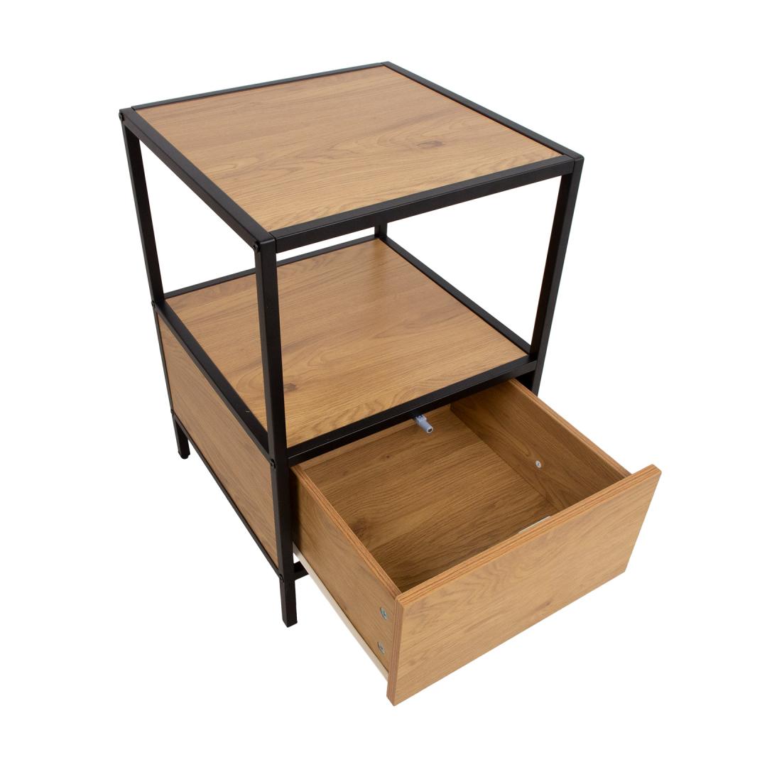 Side table/night stand HEDVIG 40x40xH59cm, ash/black. Tabletop, shelf and drawer: melamine board with ash decor. The frame of the night stand is made of metal and finished with black powder coating. Abilaud/öökapp HEDVIG 40x40xH59cm, saar/must. Lauaplaat, riiul ja sahtel: saare dekooriga melamiinplaat. Raam on valmistatud metallist ja viimistletud musta pulbervärviga.