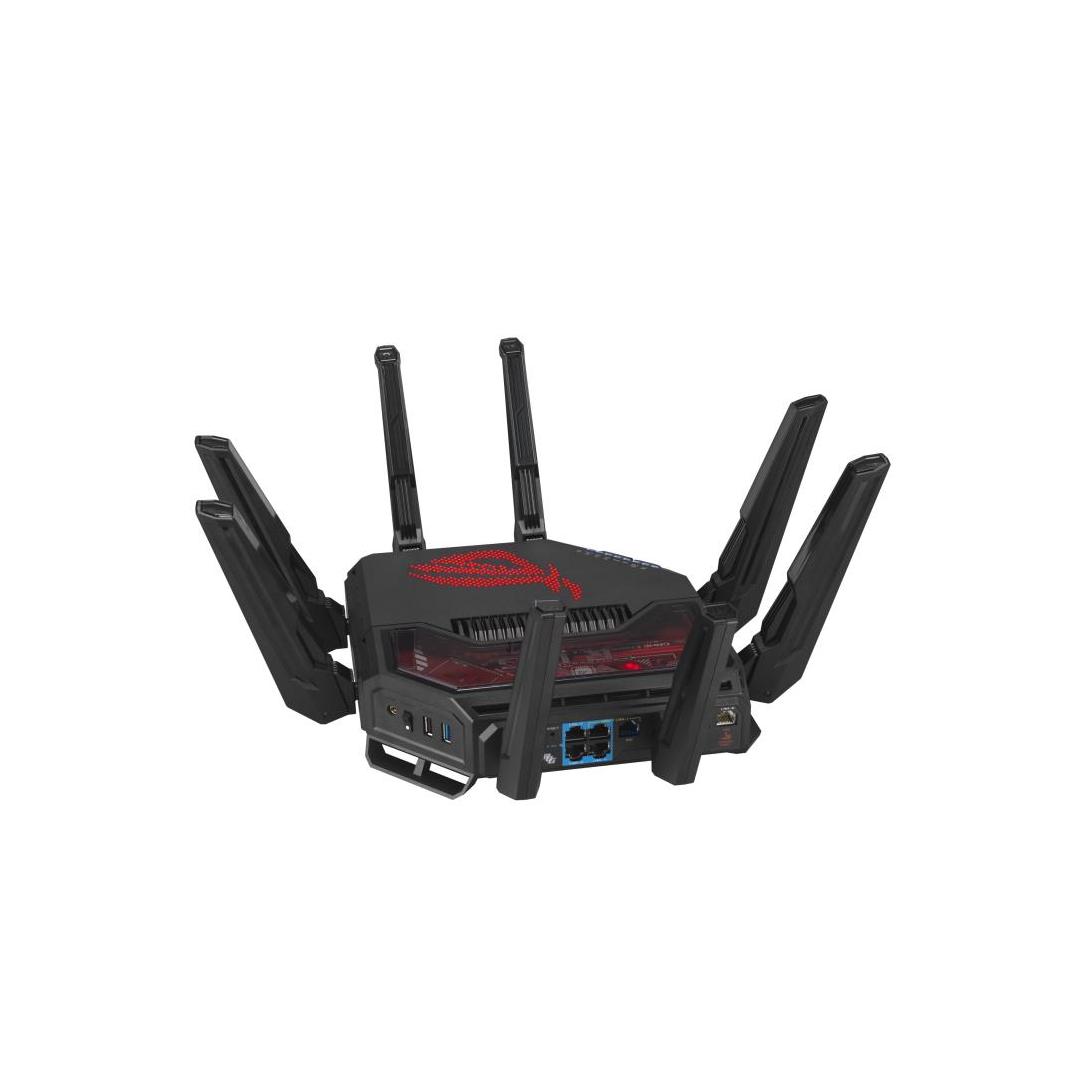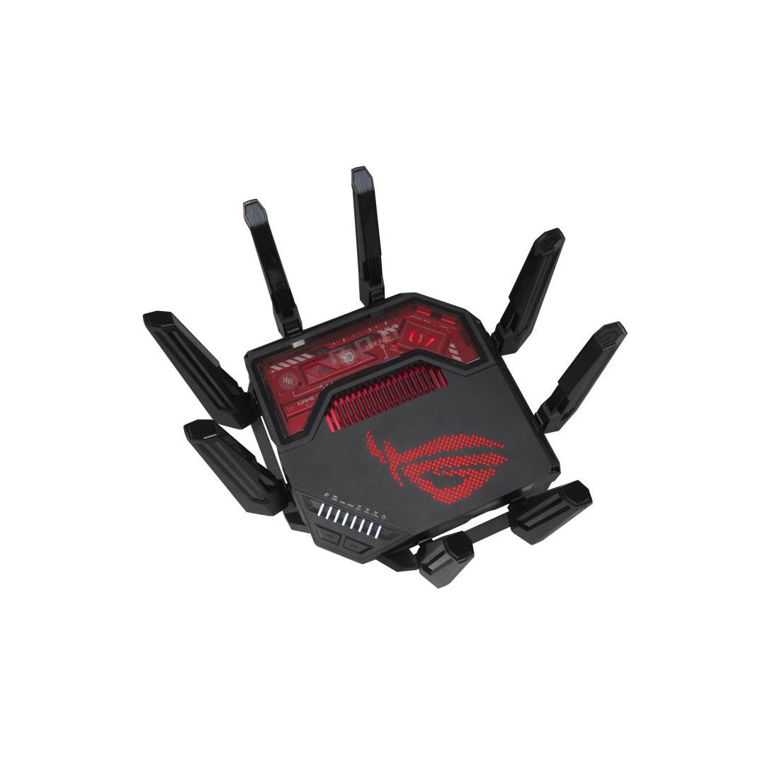 ROG Rapture GT-BE19000|Wireless Router|Available bandwidth 19000 Mbps|Wi-Fi 6|Wi-Fi 7|IEEE 802.11a|IEEE 802.11b|IEEE 802.11g|IEEE 802.11n|IEEE 802.11ac|IEEE 802.11ax|USB 2.0|USB 3.2|1x10/100/1000M|1x2.5GbE|1x10GbE|Number of antennas 8|Wireless Frequency Range 2.4 GHz / 5 GHz / 6 GHz|Activity|Link|Power|Dimensions 350.41 x 350.41 x 220.6 mm