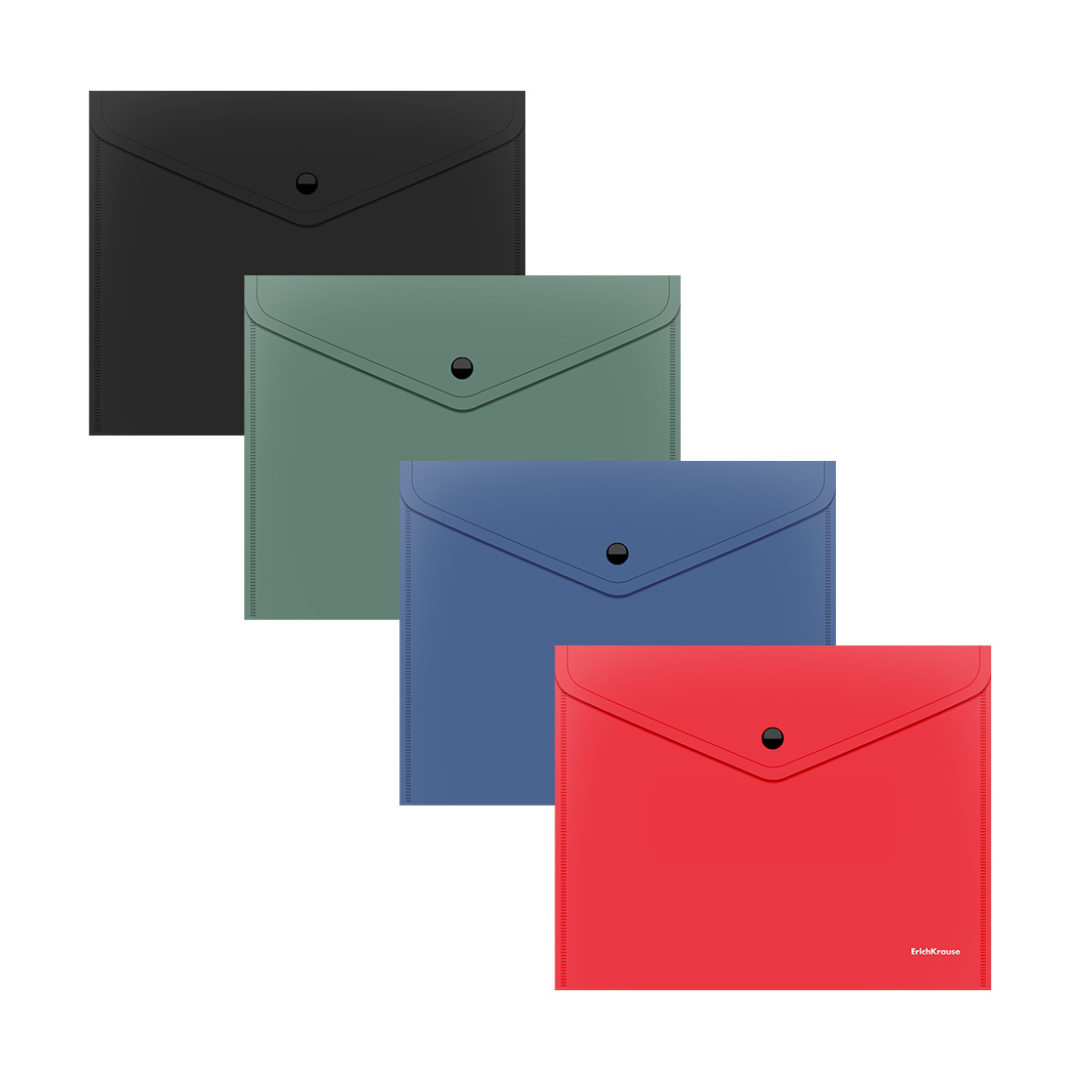 The envelope folder A5+ is made of high-quality opaque plastic with a "glossy" (mirror) surface texture. Designed to store documents. Different colors - violet, yellow, sky blue, pink. A reliable button closure for quick access to documents. Size - 239x189 mm, thickness - 0.18 mm.