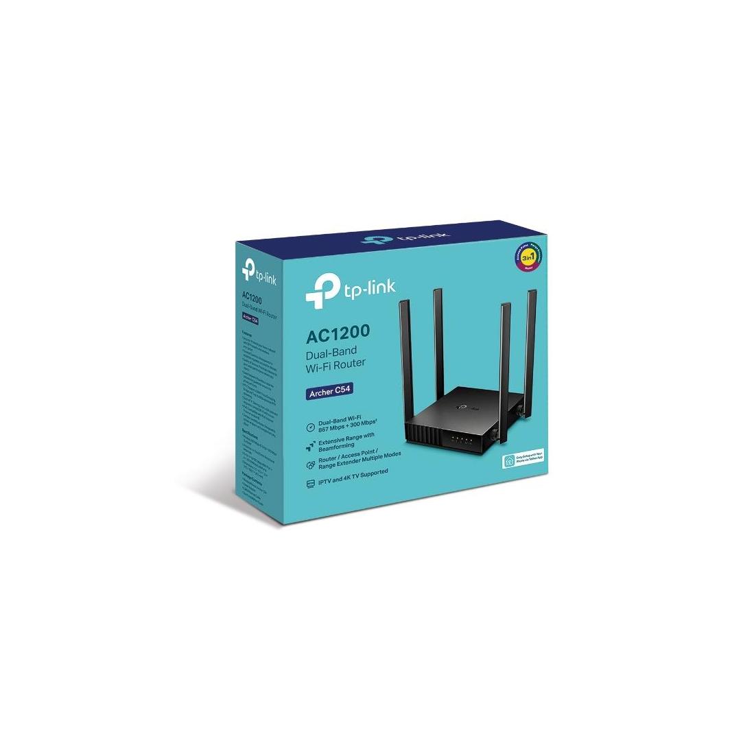 Archer C54|Wireless Router|Available bandwidth 1200 Mbps|Data transmission speed 867 Mbps|1 WAN|4x10/100M|Antenna Type Omni-Directional|Number of antennas 4|Wireless Frequency Range 2.4 and 5 GHz|Wireless Transmit Power 20 dBm|Power supply requirements 9 V ⎓ 0.85 A|Dimensions 115 × 106.7 × 24.3 mm