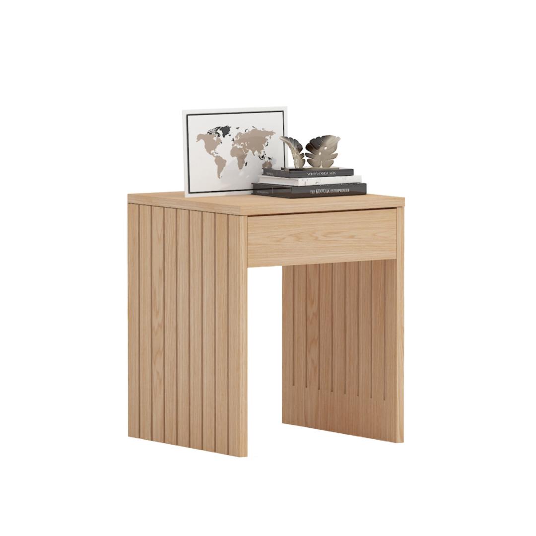 Tabletop: melamine board with light oak bark. The end panels of the table have an effective 3D finish. Öökapp SUNNY 40x40xH50cm, melamiin tamm.