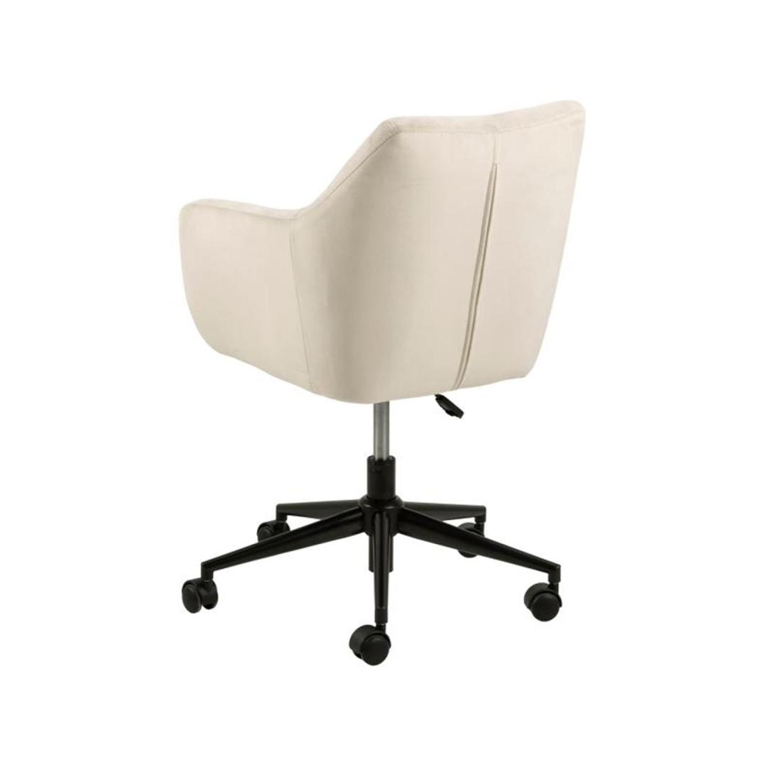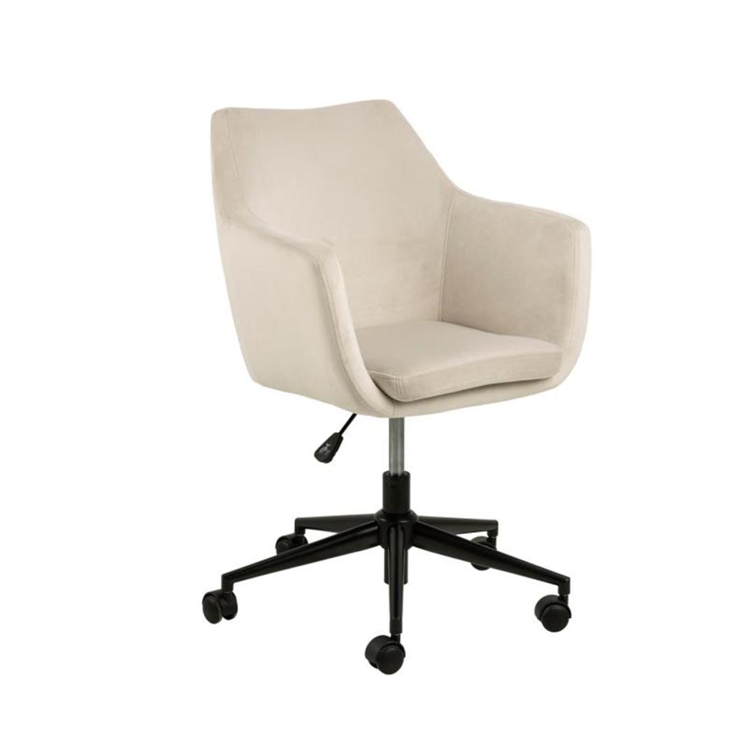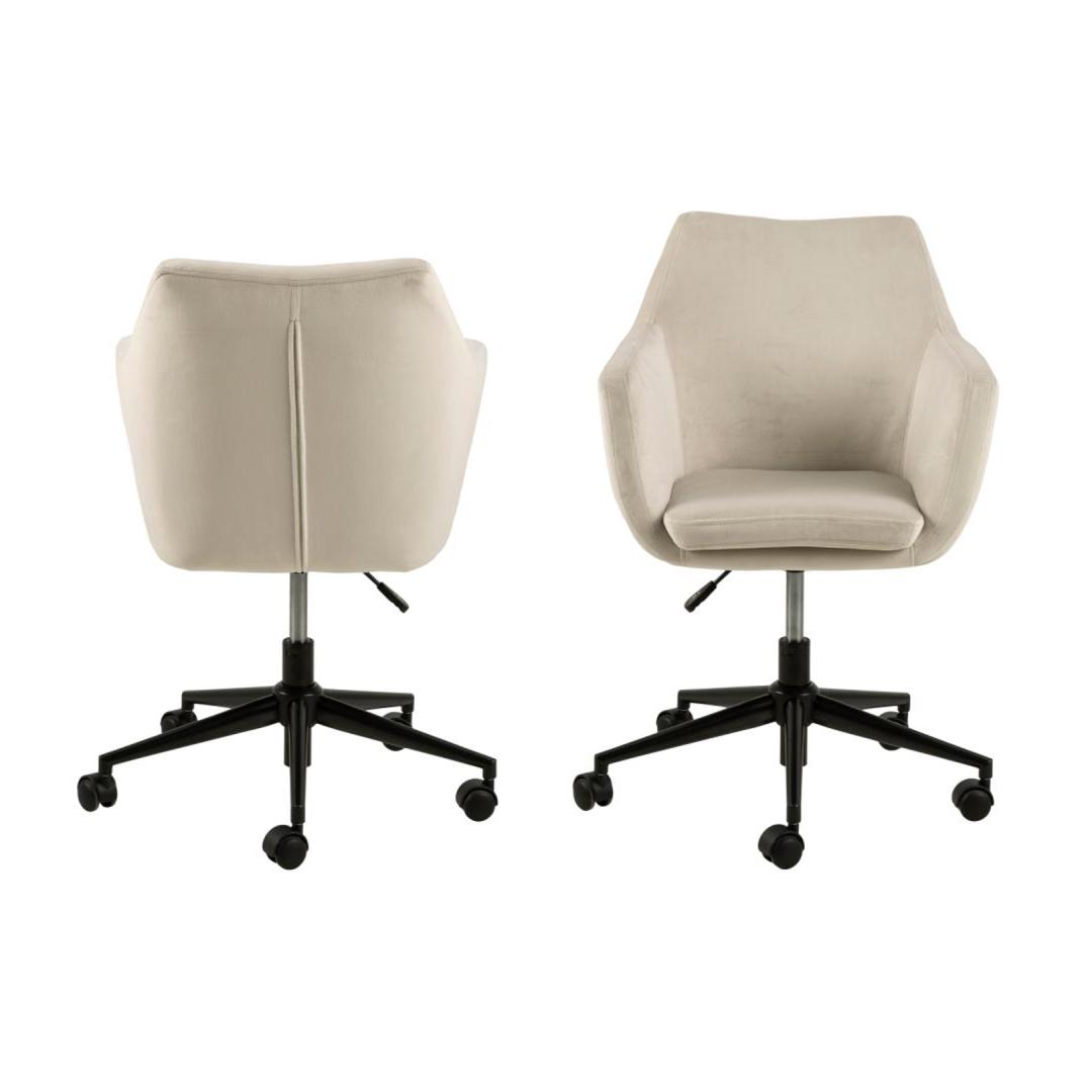 Desk chair NORA beige. The seat and backrest are covered with beige fabric: VIC fabric sand A80. The leg is made of black metal. The chair has plastic castors. Seating height 44-54cm. The dimensions of the product are 58x58xH91cm. Töötool NORA, beež. Iste ja seljatugi on kaetud beeži sametkangaga: VIC fabric sand A80. Jalarist on musta värvi metallist. Toolil on plastikrattad. Istumiskõrgus 44-54cm. Toote mõõdud on 58x58xH91cm.