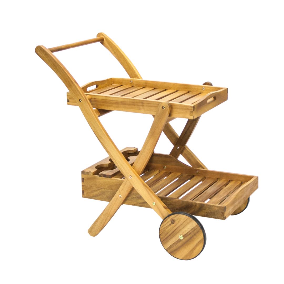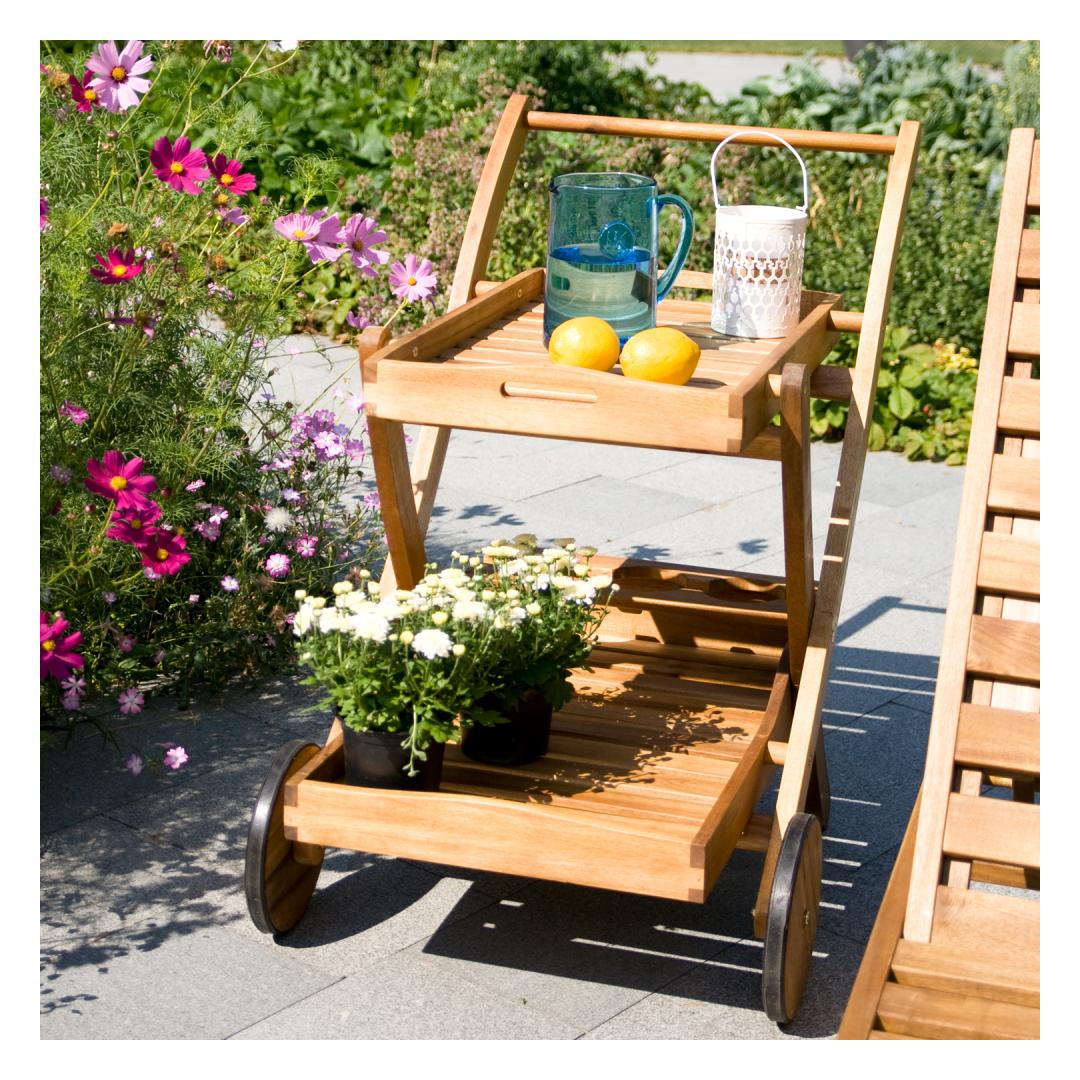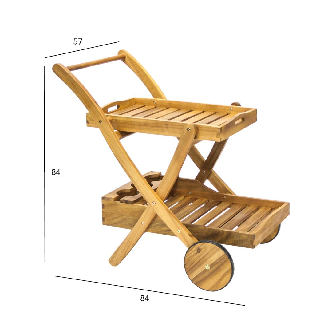 Serving trolley FINLAY 84x57xH84cm. The table is made of acacia wood and finished with wood preservative oil. The product is durable in changeable weather conditions. CARE: wood is a living product that changes and ages over time. Clean the furniture regularly and protect it from excess moisture and UV radiation. Light sanding and a new oil layer at least once a year are sufficient to give the furniture a fresh look. STORAGE: at the end of the summer season, we recommend storing the garden furniture indoors. Clean and dry the furniture before storing it. Use a dry, well-ventilated room for storage. Protect the furniture from direct sunlight during storage. Serveerimislaud FINLAY 84x57xH84cm. Laud on valmistatud akaatsia puidust ja viimistletud puidukaitseõliga. HOOLDUS: puit on elav looduslik materjal, mille välisilme ilmastikutingimuste tõttu muutub. Puhastage mööblit regulaarselt, kaitske liigniiskuse ja UV kiirguse eest. Kerge lihvimine ja uus õlikiht vähemalt korra aastas on piisav värskenduskuur mööblile uue näo andmiseks. HOIUSTAMINE: suvehooaja lõppedes soovitame aiamööblit hoiustada siseruumides. Puhastage ja kuivatage mööbel enne hoiule panekut. Kasutage hoiustamiseks kuiva ning hea ventilatsiooniga ruumi. Kaitske mööblit hoiustamise ajal otsese päikesevalguse eest.