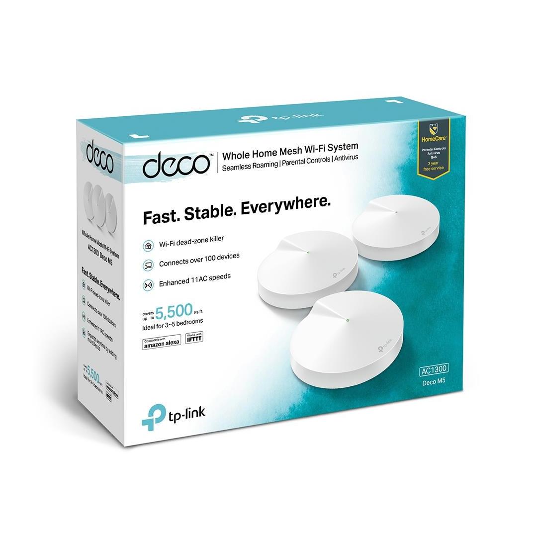 Wireless Router|Available bandwidth 1300 Mbps|Included Accessories 3 Deco M5 units; 1 RJ45 Ethernet cable; 3 power adapters; 1 Quick Start Guide|Colour White|Dimensions 120 × 120 × 38 mm