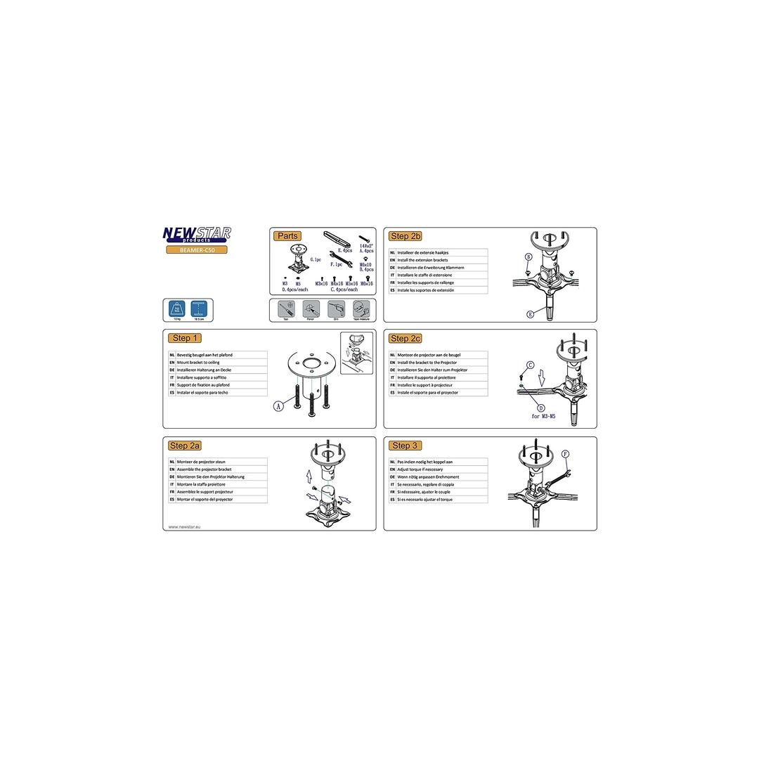 Neomounts BEAMER-C50 has two pivot points and is suitable for most projectors. The weight capacity of this product is 10 kilograms. This universal ceiling mount is easy to install and suitable for projectors using the mounting holes on the bottom side of the projector. The legs included with this mount, cover most projector hole patterns.