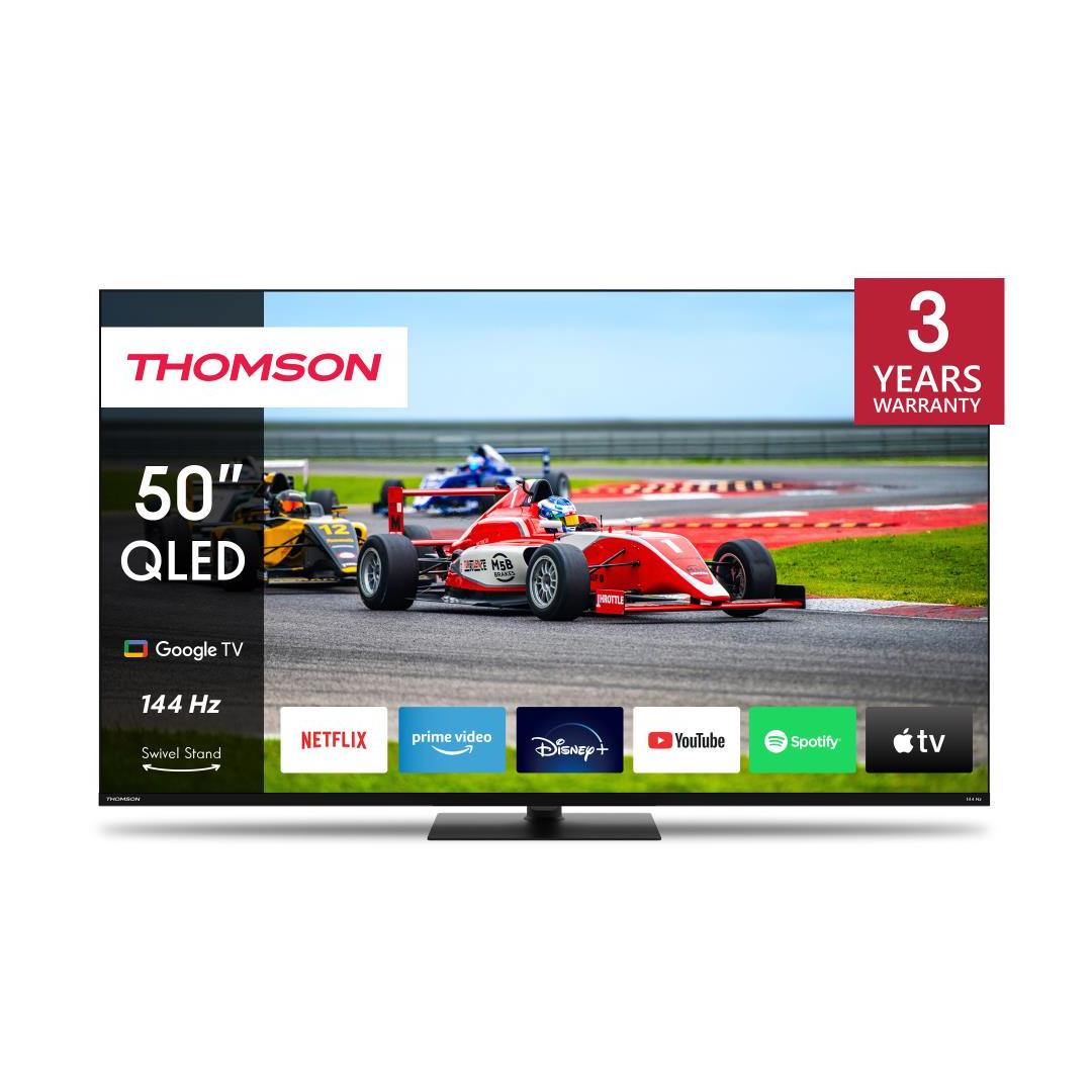 Experience fluent images and high responsiveness in rich 4K UHD quality with the Thomson Google TV 50" QLED Pro. A 144 Hz refresh rate ensures smooth and responsive visuals, ideal for fast-paced content like action movies, sports and gaming. This feature reduces motion blur and display lag, delivering the most comfortable viewing and gaming experience. Powered by Quantum Dot nanocrystals, a QLED display delivers balanced brightness, striking contrasts, and an expanded color range. Combined with 4K Ultra HD resolution you can capture every detail and immerse yourself in crystal clear images. Dolby Vision technology enhances the brightness in each scene, ensuring precise color reproduction for lifelike images. Enjoy dynamic audio with Dolby Atmos for an immersive TV experience. Google TV simplifies your entertainment by organizing content from your apps and subscriptions. Create multiple user profiles and benefit from curated recommendations. Enjoy a wide range of smart features, such as access to 400,000+ movies and TV shows, smart voice control with Google Assistant, and Chromecast built-in to stream content from compatible smart devices to your TV. The ergonomic remote control with smooth backlighting allows you to keep an eye on everything, even in dim lighting. The integrated Google Assistant enables you to intuitively control your TV with voice commands. Search for your favorite movies, ask for recommendations based on your mood, or control compatible smart devices - all with the convenience of your voice. Benefit from increased placement flexibility with the central swivel stand and enhance your viewing experience. The innovative design enables you to effortlessly rotate your TV by up to 30 degrees, allowing you find the perfect angle for your entertainment setup. The built-in triple tuner makes reception via satellite-antenna, terrestrial antenna, or cable possible. Easily receive all available channels without additional hardware.