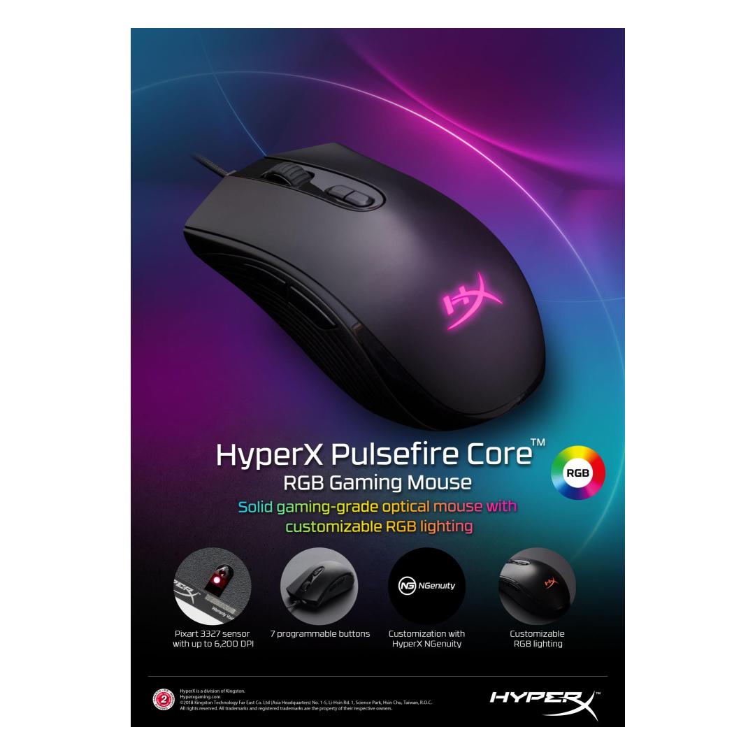 The HyperX Pulsefire Core™ delivers the essentials for gamers looking for a solid, comfortable, wired RGB gaming mouse. The Pixart 3327 optical sensor gives players precise, smooth tracking with no hardware acceleration, and has native DPI settings up to 6200 DPI. The ergonomically-designed Pulsefire Core has textured side grips for a comfortable, no-slip grip, and its symmetrical shape is suitable for both palm and claw grip. It features high-quality switches with crisp tactile feedback rated for up to 20 million clicks. Customize lighting, DPI settings, and macros for 7 programmable buttons with HyperX NGenuity software and set your mouse up just the way you want it. The large skates on Pulsefire Core help deliver accurate aiming by giving you a smooth, controlled glide as you move the mouse.