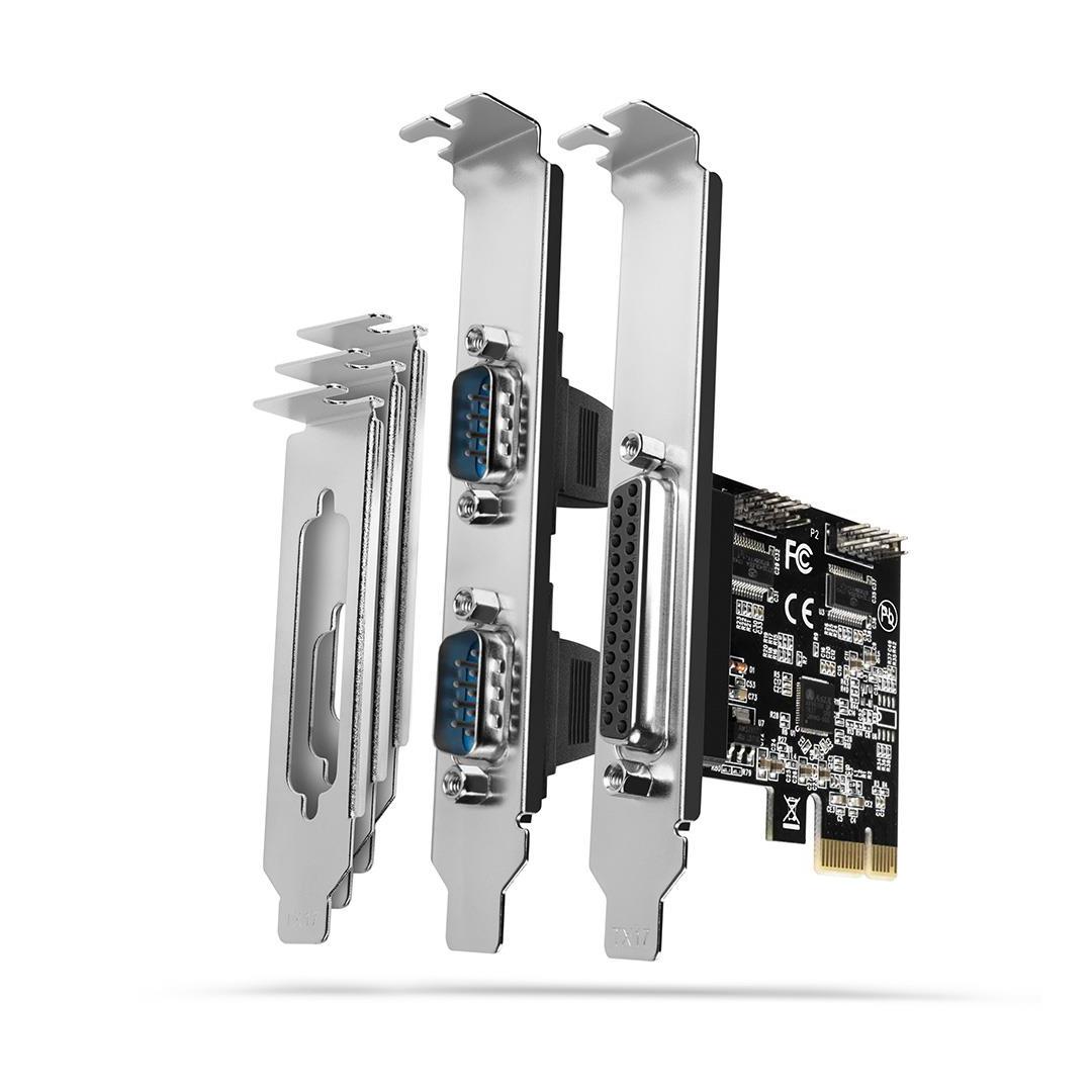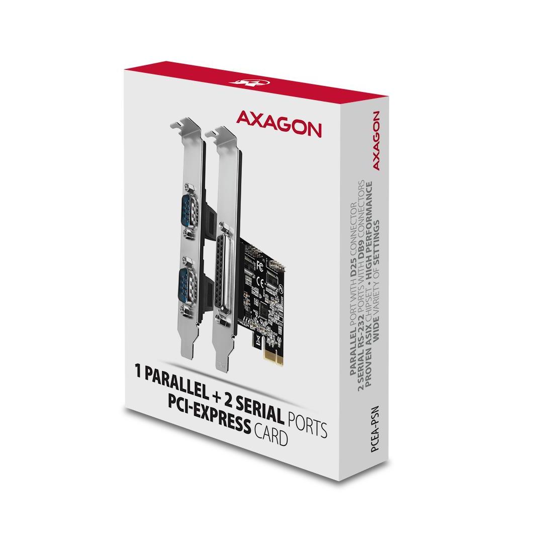 The AXAGON PCEA-PSN PCI-Express card extends your desktop PC by one parallel port with a DB25 connector on the board and two RS-232 standard serial ports with DB-9 connectors on the bracket.