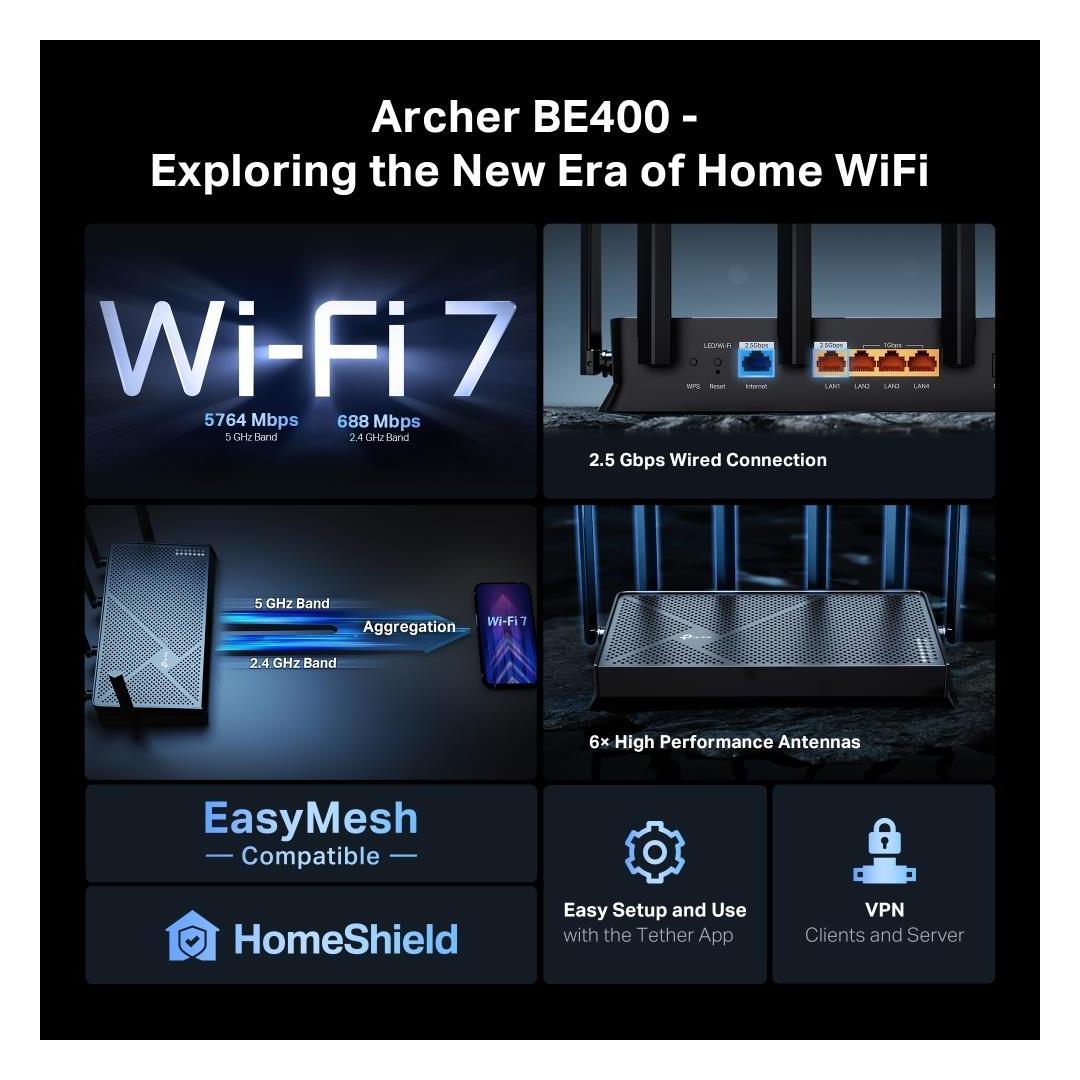 Archer BE400|Wireless Router|Available bandwidth 6500 Mbps|Wi-Fi 7|3x10/100/1000M|1x2.5GbE|WPA - Wi-Fi Protected Access|WPA2 - Wi-Fi Protected Access|WPA3|Number of antennas 6|Colour Black