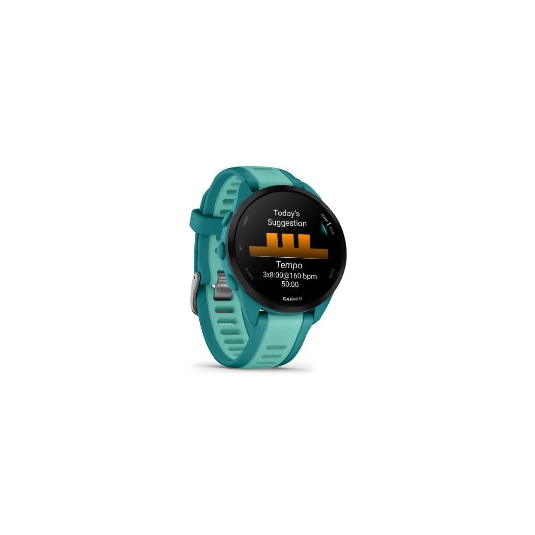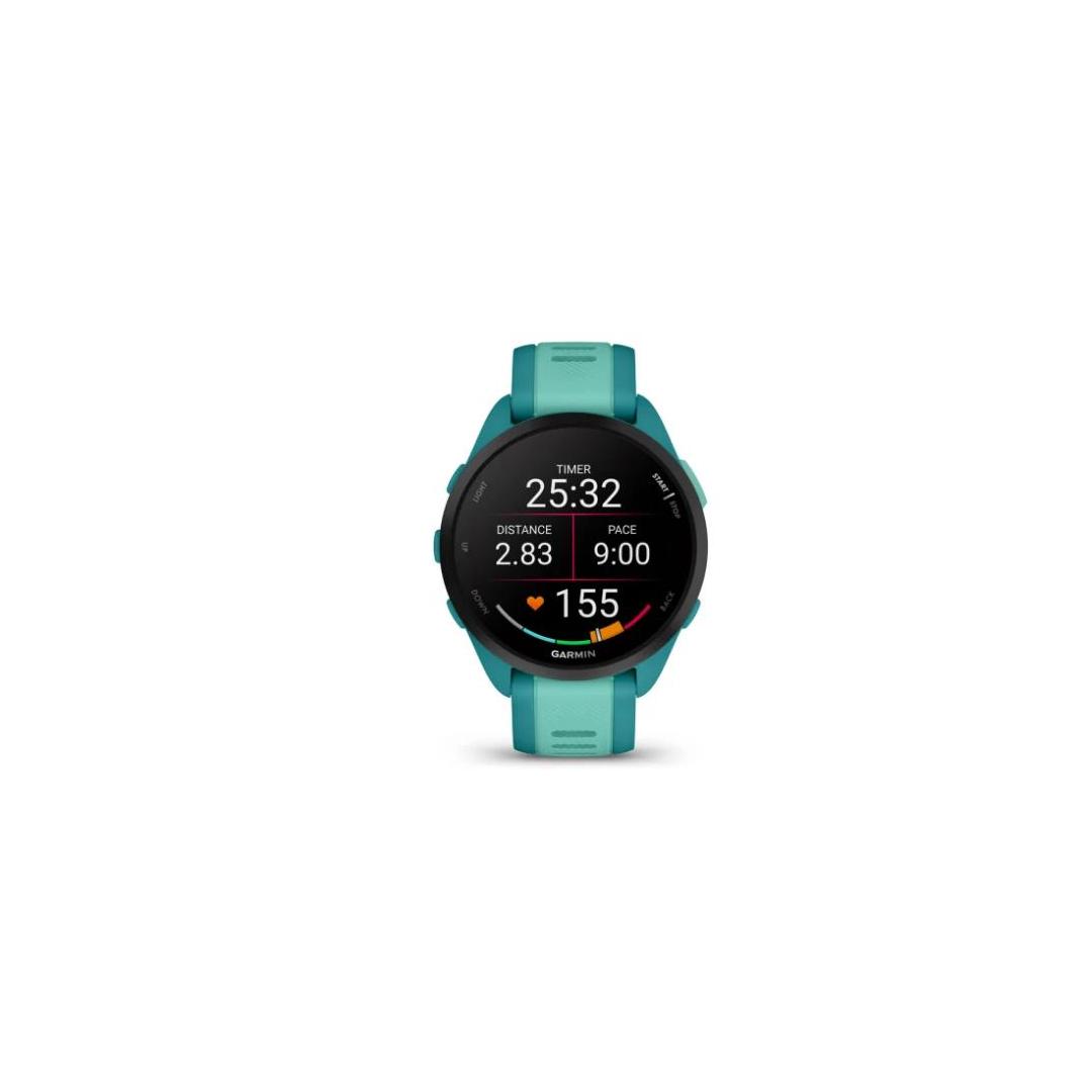Forerunner® 165|Screen 1.2"|Display technology AMOLED|Resolution 390 x 390|Wireless connections WLAN/Bluetooth|Memory 4 GB|GPS|Colour Aqua|Dimensions 43 x 43 x 11.6 mm|Weight 0.039 kg