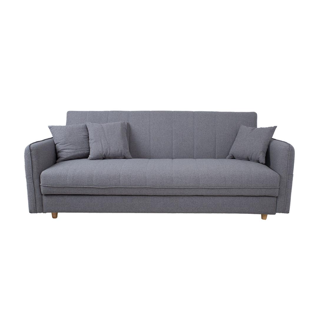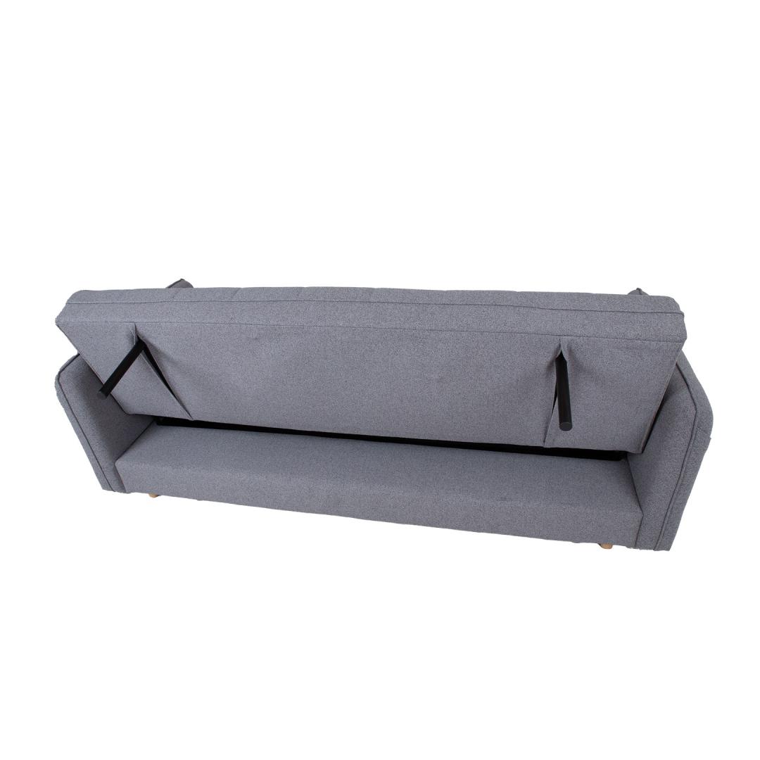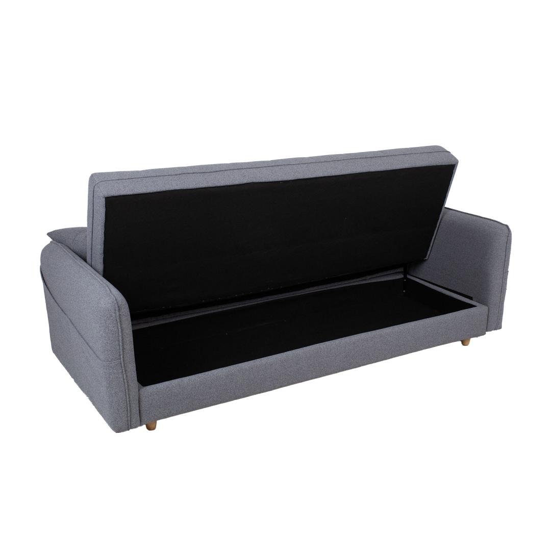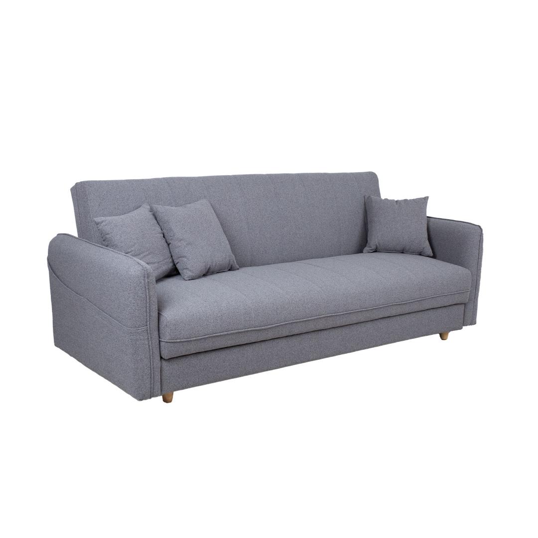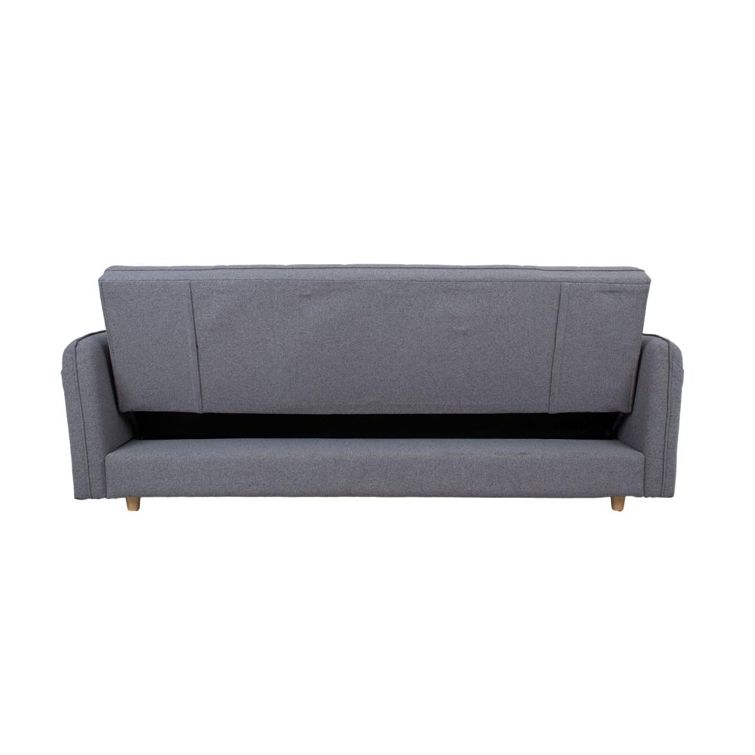 The sofa has light wooden legs. Diivanvoodi VISBY pesukastiga, hall.