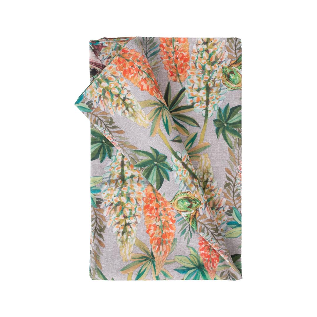 Table mat LONETA NEW 136x220cm, flowers and frogs. 50% polyester, 50% cotton, fabric 484. CARE: can be washed at 30 degrees in the washing machine. Laudlina LONETA NEW 136x220cm, lilled ja konnad, 50% polüester, 50% puuvill, kangas 484. HOOLDUS: võib pesta temperatuuril 30 kraadi pesumasinas.