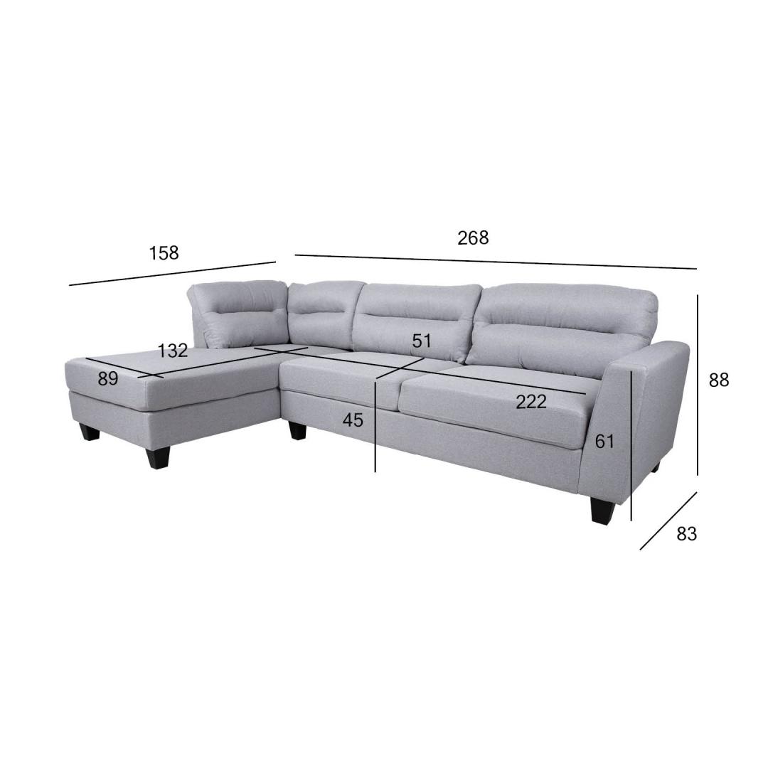 Diivani üldmõõdud on 268x158/83xH88cm. Istme laius 165+57cm, istme sügavus 51/132cm, istme kõrgus 45cm. Käetoe kõrgus maast 61cm, käetoe laius 15cm.