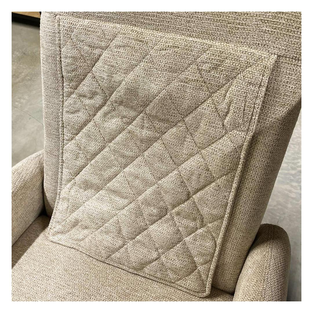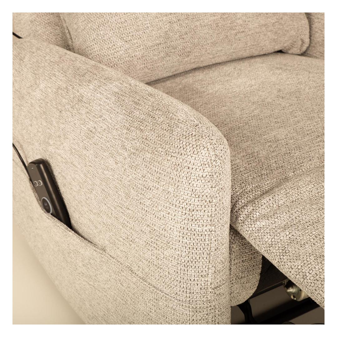 The position of the back and footrest of the recliner type armchair can be changed using a remote-controlled electric mechanism. When the footrest is raised, the backrest moves smoothly into the reclining position.