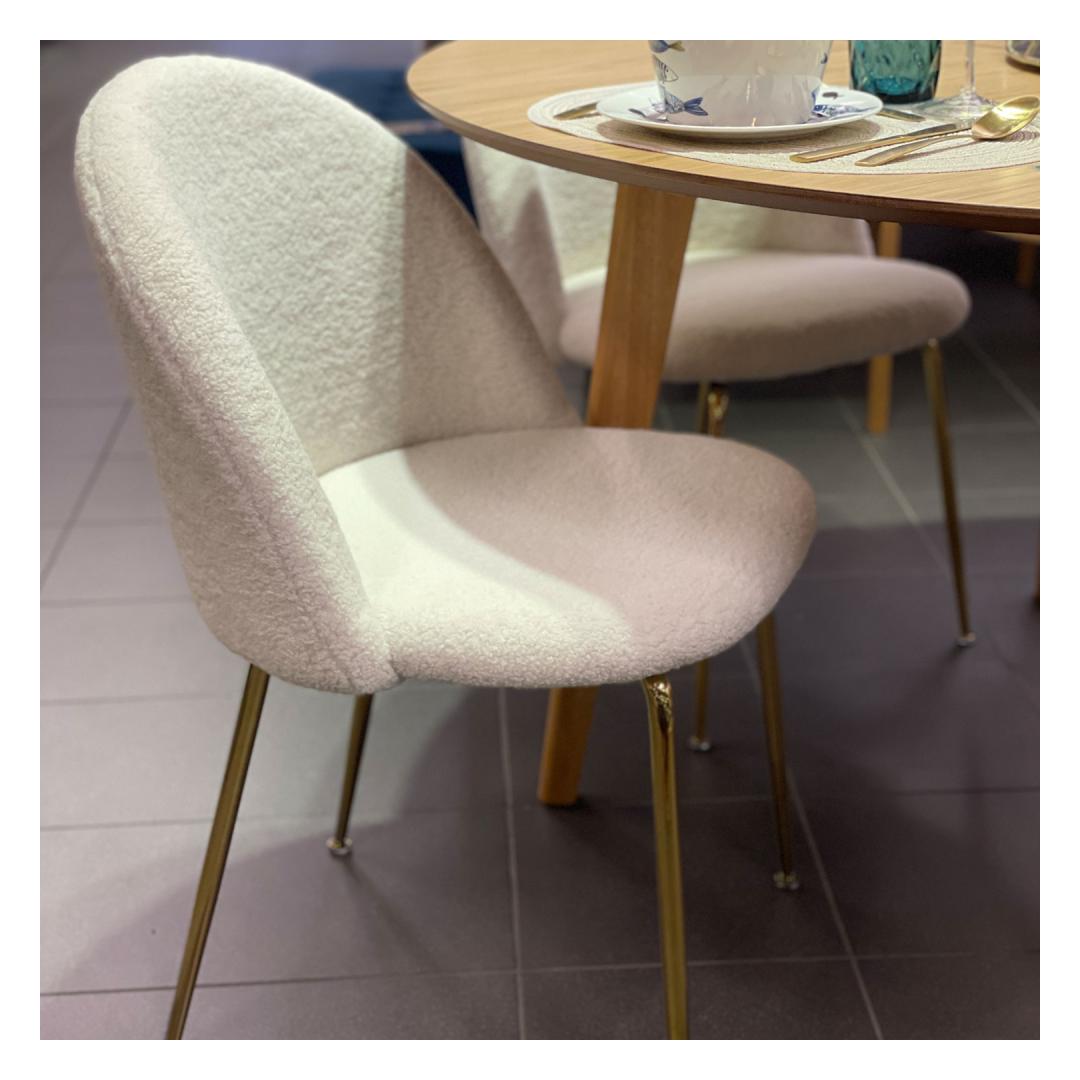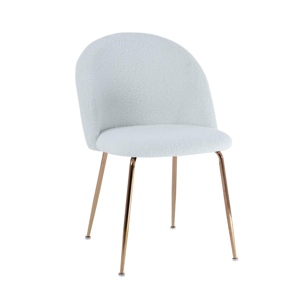 Chair BEETLE, white. The luxurious-looking, elegant and comfortаble BEETLE chair brightens up any room and creates a warm, cozy feeling. The seat and back of the chair are upholstered and covered with high-quality, soft plush fabric. Cover material: 100% polyester, 400g/m². The metal legs are finished with golden powder paint. The overall dimensions of the chair are 54x56xH78cm, seat width 50cm, seat depth 43cm, seat height 45cm. Backrest height 37cm. Weight limit 100 kg.