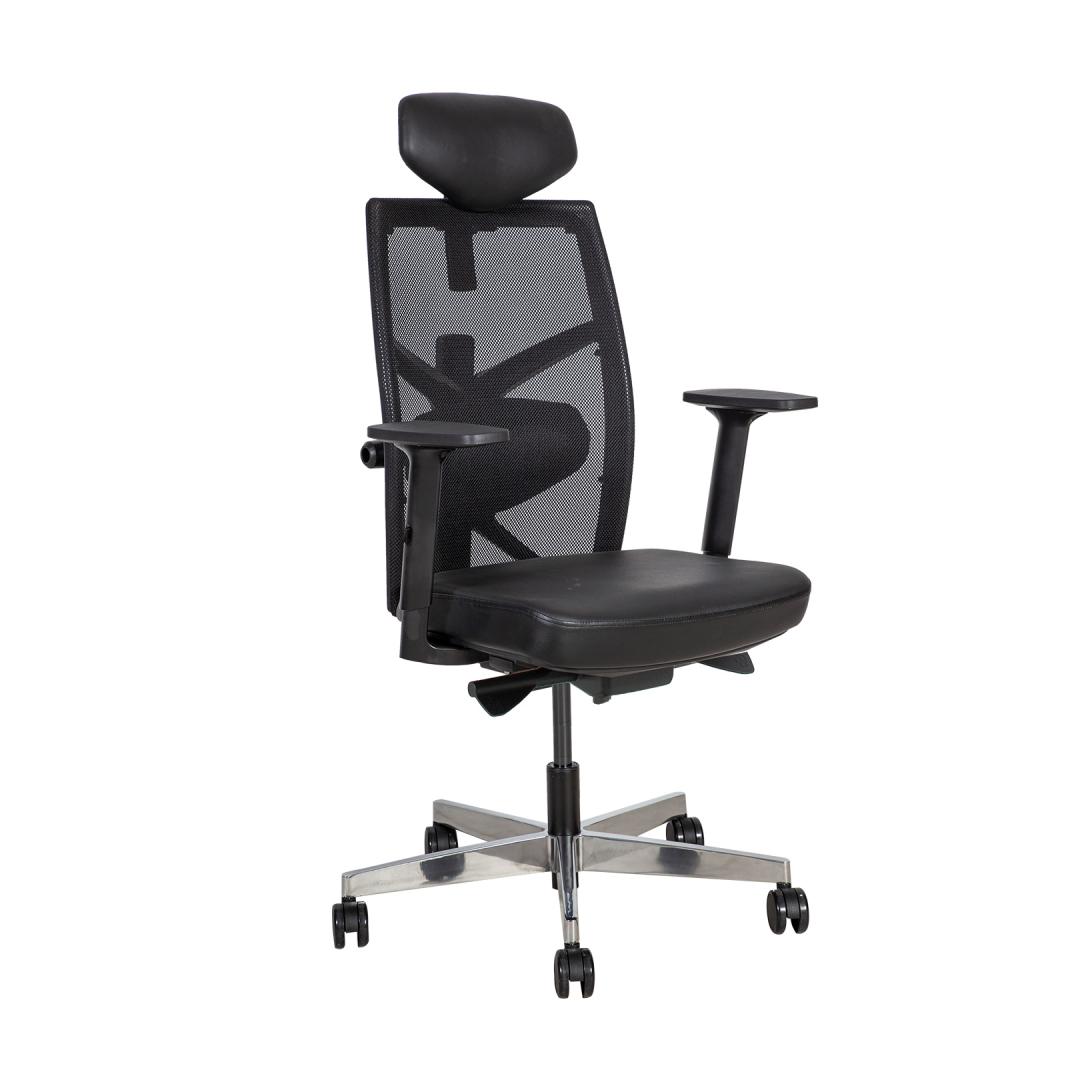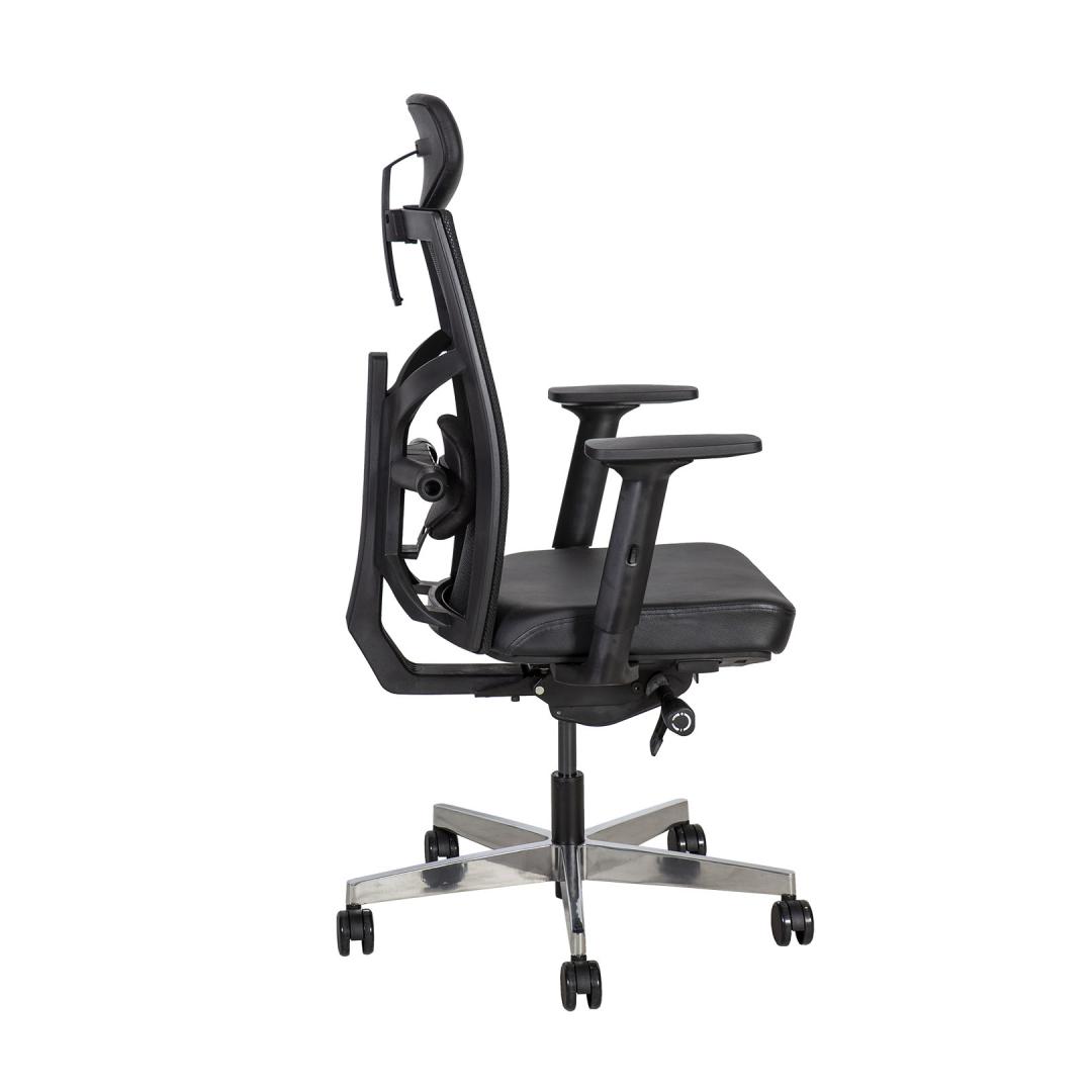 Office chair TUNE, black leather. The seat of the chair is covered with leather, the back is covered with polyester mesh fabric. The plastic body of the chair is black. The chair has a swing mechanism, locking in several positions, automatic swing stiffness adjustment. The height of the backrest is adjustable from 50 to 60.5 cm. Adjustable lumbar support. The height of the seat is adjustable using a gas damper. The seat depth is adjustable 44-48cm. The black plastic armrests are adjustable in three directions. The height of the armrests is adjustable from 20.5 to 30.5 cm. The support surface of the armrests can be pushed back and forth and the angle of rotation can be changed in and out. The headrest can be freely tilted by 30°, the height of the headrest is adjustable. The 5-pronged footrest is made of aluminum, D70cm. The chair has floor-saving wheels with brakes, 65mm. The overall dimensions of the chair are 70x70xH111-128cm. Chair height is 111-128cm, seat height 41.5-51.5cm, seat depth 44-48cm, seat width 49cm. Weight limit 120 kg.