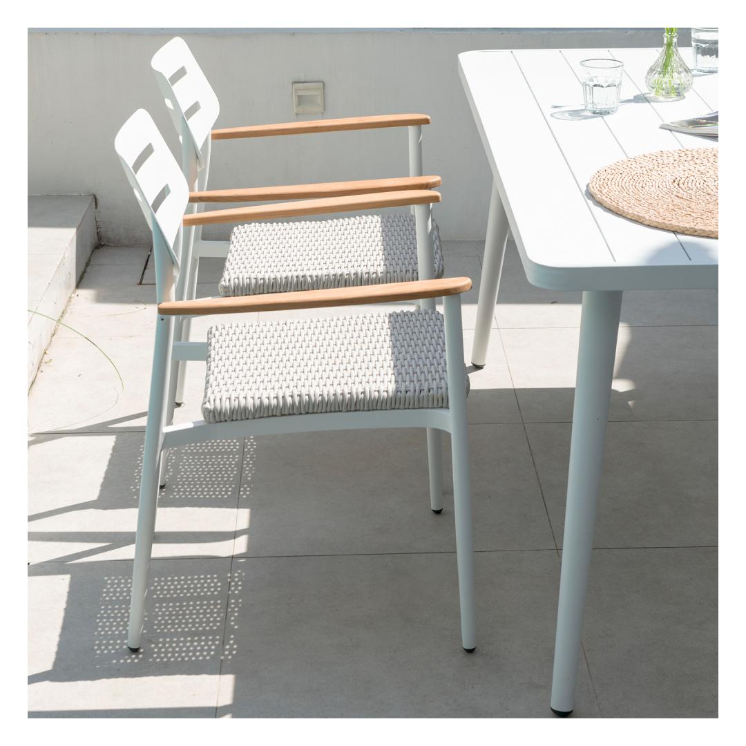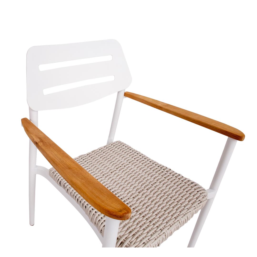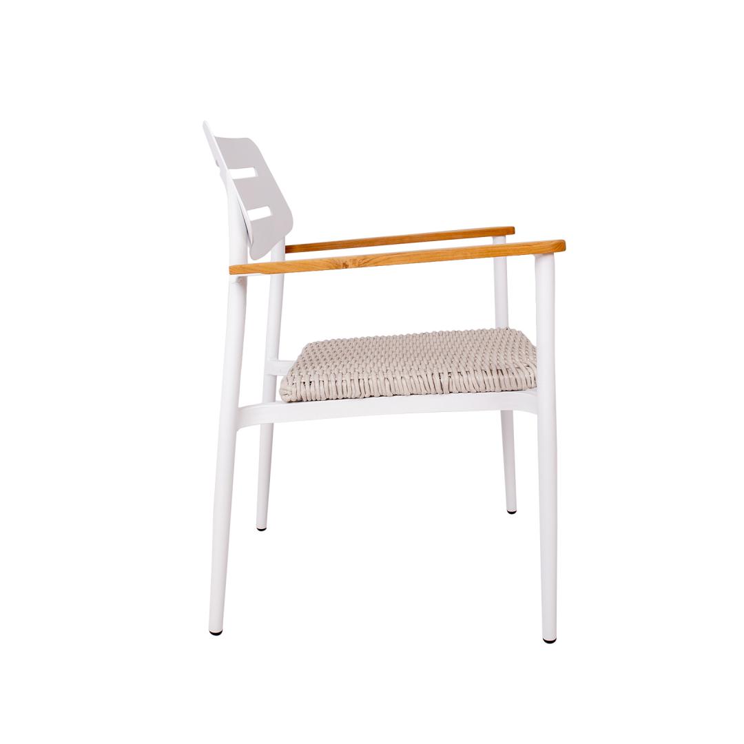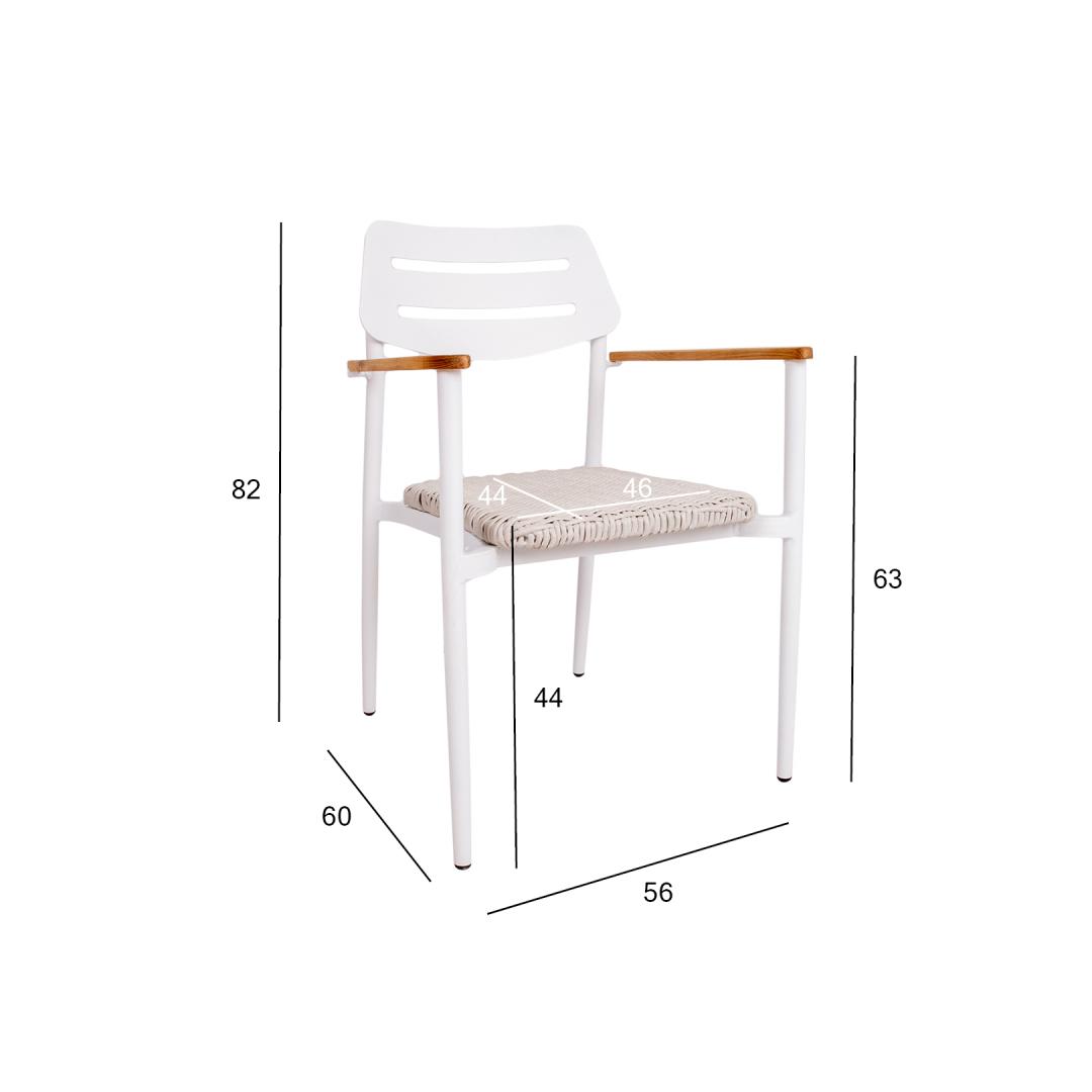 Chair WALES white. By placing garden chairs on the balcony, terrace or garden, you can create a cozy seating area where you can enjoy the beautiful weather during the day or spend cozy evenings. By choosing a suitаble tаble, you can create a harmonious set that you like. The seat of the chair is covered with beige plastic braid. The armrests are made of natural teak wood slats. The frame and backrest of the chair are made of white aluminum. The dimensions of the metal tube are D28x1.2mm. The chair is stackable, which makes it easier to store. The dimensions of the chair are 56x60xH82cm.