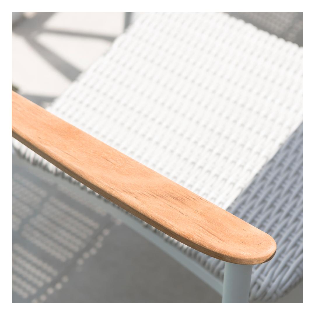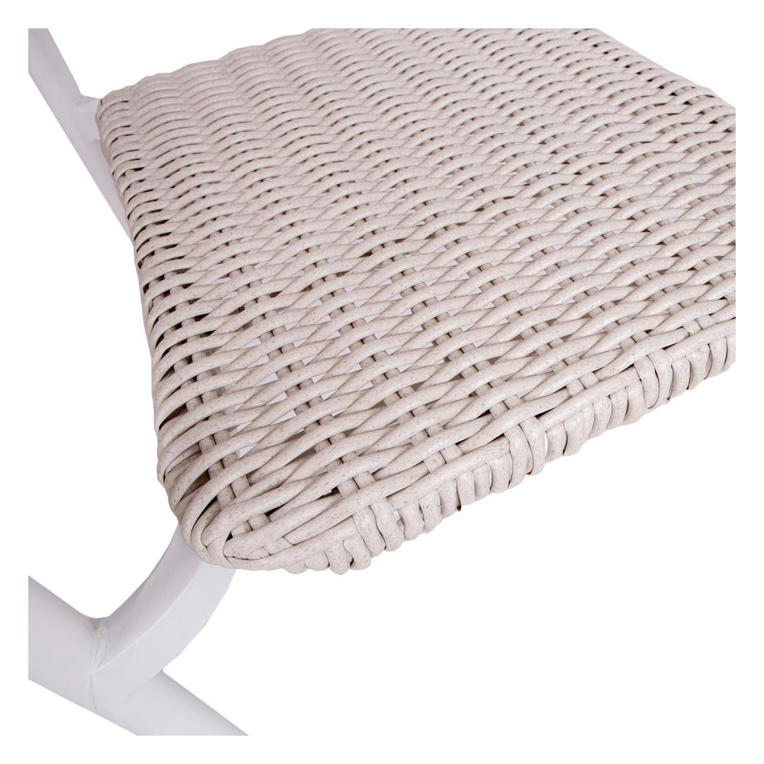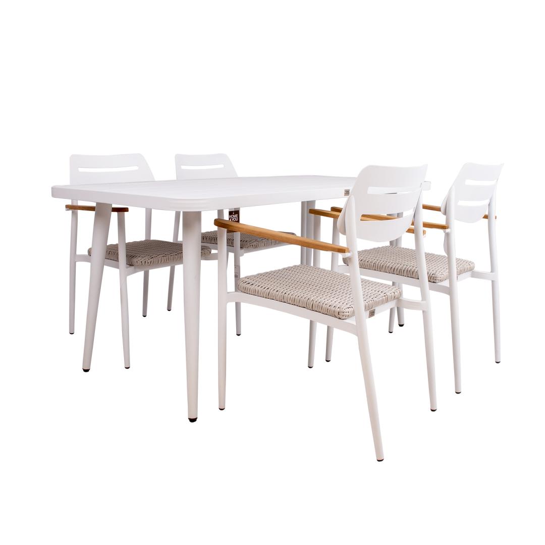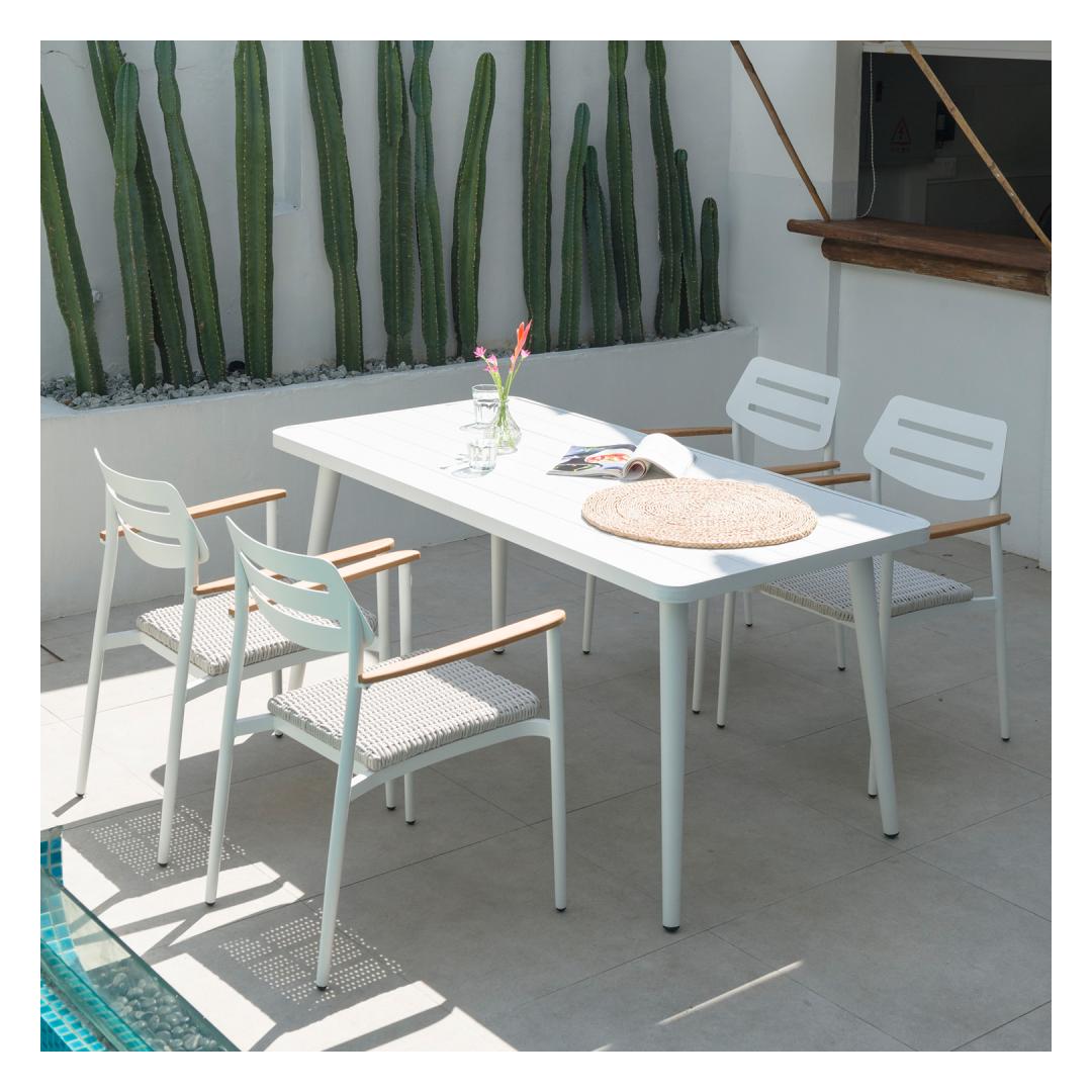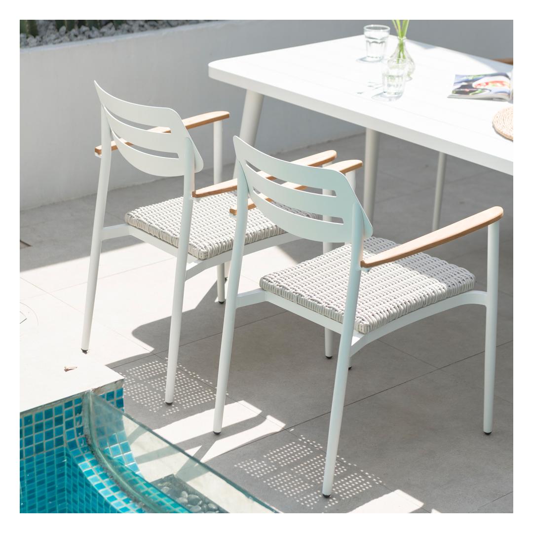 Chair WALES white. By placing garden chairs on the balcony, terrace or garden, you can create a cozy seating area where you can enjoy the beautiful weather during the day or spend cozy evenings. By choosing a suitаble tаble, you can create a harmonious set that you like. The seat of the chair is covered with beige plastic braid. The armrests are made of natural teak wood slats. The frame and backrest of the chair are made of white aluminum. The dimensions of the metal tube are D28x1.2mm. The chair is stackable, which makes it easier to store. The dimensions of the chair are 56x60xH82cm.