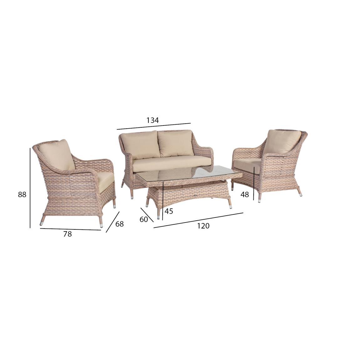 Garden furniture set EDEN table, sofa and 2 armchairs. The frames of all parts of the set are made of aluminum and covered with beige plastic braid. Table dimensions are 120x60xH45cm, tabletop: 5mm transparent tempered glass. The sofa measures 134x78xH88cm, the armchair measures 68x78xH88cm. Pillows are included. The cushion covers are made of beige polyester fabric. The product is durable in changing weather conditions and very easy to maintain, only the cushions need protection from weather conditions. To extend the life of outdoor furniture, we recommend using outdoor furniture covers. STORAGE: At the end of the summer season, we recommend storing the garden furniture indoors. Clean and dry the furniture before storing. Use a dry and well-ventilated room for storage.
