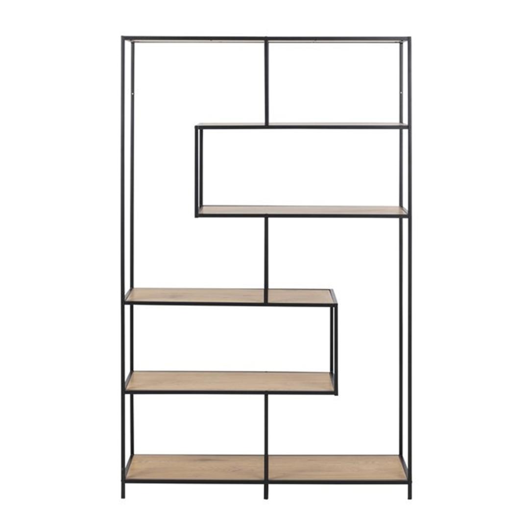 Shelf SEAFORD 114x35xH185cm, oak. A tasteful and practical shelf can be used in different rooms for convenient storage of things. The shelves are made of furniture board with a laminated coating. The color is oak. The frame is made of black metal. The dimensions of the product are 114x35xH185cm.
