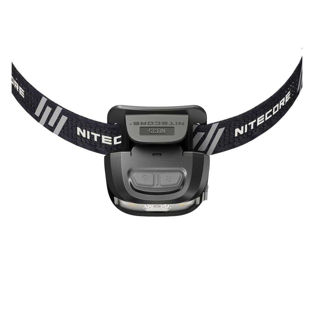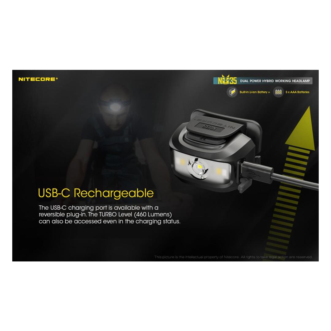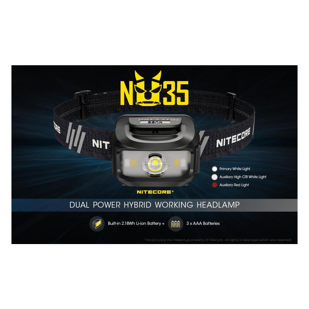 The Nitecore NU35 headlamp features a Cree XP-G3 S3 LED with a maximum output of 460 lumens. The light gives you the option of using two power sources with a built-in 590 mAh lithium-ion battery or using 3 x AAA cells. Note that if you insert AAA batteries, the headlamp prefers to use them over the built-in cell. Dual power sources mean the NU35 has up to 10 hours of run time on high mode, 4 hours from the built-in battery and an additional 6 hours using AAA cells. The lithium-ion battery is rechargeable via USB-C, simply plug the included charging cable intο the port on the side of the light. The NU35 has a primary white light that provides a smooth flood beam ideal for search and rescue, maintenance, emergency, construction and walking. The headlamp also features a red and high CRI white auxiliary light, which increases the light´s versatility, making it suitable for wildlife viewing, camping and night photography. With such brightness levels and outputs, the NU35 has a simple user interface consisting of two switches on top of the headlamp with physical protection to prevent accidental activation. Brightness levels: (using built-in Li-ion battery) Turbo: 460 lumens - 15 minutes runtime High: 210 lumens - 4 hours runtime Medium: 38 lumens - 7 hours 45 minutes runtime Low: 1 lumen - 170 hours runtime High CRI White light: 22 lumens - 7 hours runtime Red High: 12 lumens - 5 hours runtime Red Low: 2 lumens - 32 hours runtime Red Flash: 12 lumens - 10 hours runtime (using 3 x AAA batteries) Turbo: 460 lumens - 15 minutes runtime High: 210 lumens - 6 hours runtime Medium: 38 lumens - 9 hours runtime Low: 1 lumen - 170 hours runtime High CRI White light: 22 lumens - 12 hours runtime Red High: 12 lumens - 8 hours runtime Red Low: 2 lumens - 50 hours runtime Red Flash: 12 lumens - 15 hours working time plus SOS and beacon (460 lumens). Maximum beam distance 48 meters, waterproof IP66 and shockproof up to 1 meter. Included: