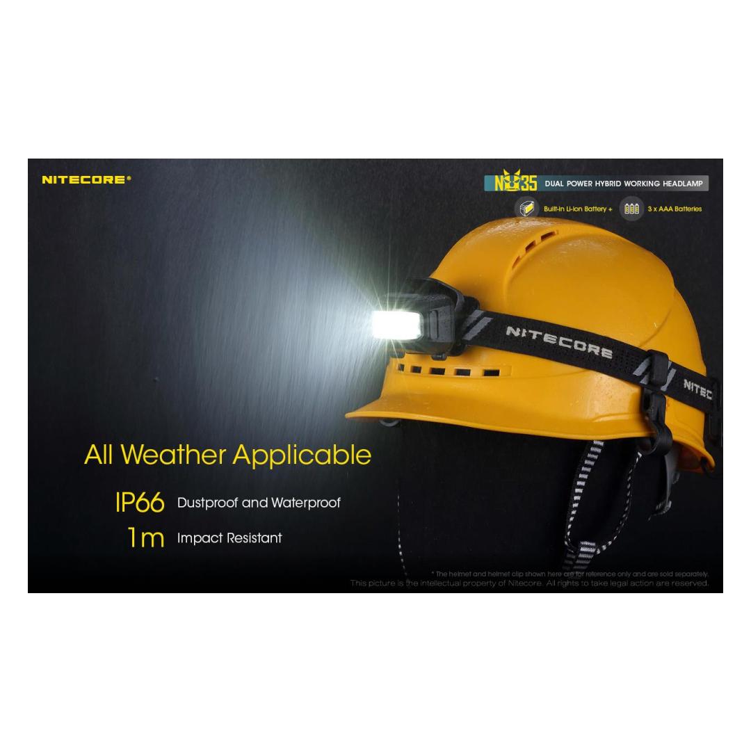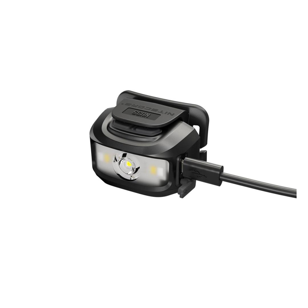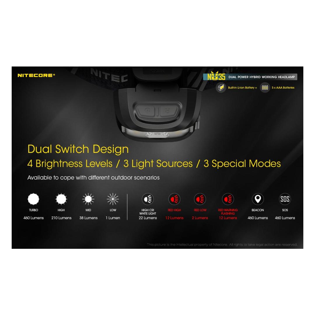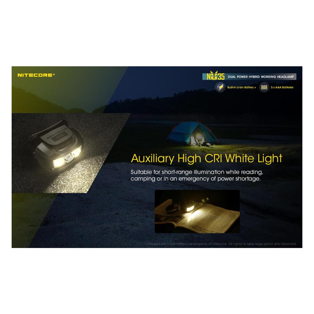 The Nitecore NU35 headlamp features a Cree XP-G3 S3 LED with a maximum output of 460 lumens. The light gives you the option of using two power sources with a built-in 590 mAh lithium-ion battery or using 3 x AAA cells. Note that if you insert AAA batteries, the headlamp prefers to use them over the built-in cell. Dual power sources mean the NU35 has up to 10 hours of run time on high mode, 4 hours from the built-in battery and an additional 6 hours using AAA cells. The lithium-ion battery is rechargeable via USB-C, simply plug the included charging cable intο the port on the side of the light. The NU35 has a primary white light that provides a smooth flood beam ideal for search and rescue, maintenance, emergency, construction and walking. The headlamp also features a red and high CRI white auxiliary light, which increases the light´s versatility, making it suitable for wildlife viewing, camping and night photography. With such brightness levels and outputs, the NU35 has a simple user interface consisting of two switches on top of the headlamp with physical protection to prevent accidental activation. Brightness levels: (using built-in Li-ion battery) Turbo: 460 lumens - 15 minutes runtime High: 210 lumens - 4 hours runtime Medium: 38 lumens - 7 hours 45 minutes runtime Low: 1 lumen - 170 hours runtime High CRI White light: 22 lumens - 7 hours runtime Red High: 12 lumens - 5 hours runtime Red Low: 2 lumens - 32 hours runtime Red Flash: 12 lumens - 10 hours runtime (using 3 x AAA batteries) Turbo: 460 lumens - 15 minutes runtime High: 210 lumens - 6 hours runtime Medium: 38 lumens - 9 hours runtime Low: 1 lumen - 170 hours runtime High CRI White light: 22 lumens - 12 hours runtime Red High: 12 lumens - 8 hours runtime Red Low: 2 lumens - 50 hours runtime Red Flash: 12 lumens - 15 hours working time plus SOS and beacon (460 lumens). Maximum beam distance 48 meters, waterproof IP66 and shockproof up to 1 meter. Included:
