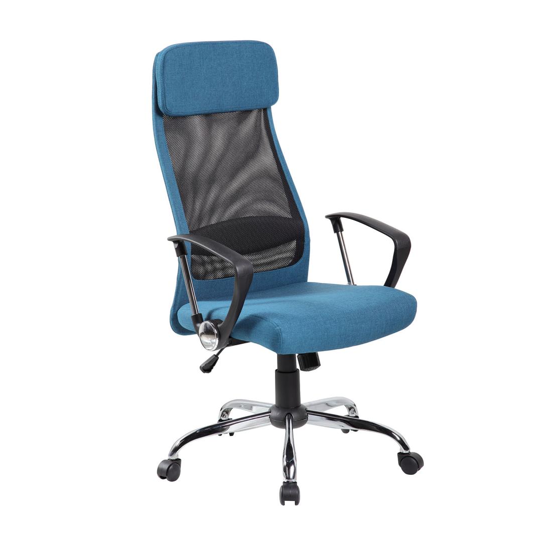 Task chair DARLA blue. The chair is covered with blue polyester fabric and polyester mesh fabric. The chair has a tilt mechanism, pneumatic seat height adjustment. The armrests are made of metal and plastic. The base is made of metal, color: chrome. The chair has plastic castors, D50mm, pin: 11mm. Height 116-126cm, seat height 46-56cm. The dimensions of the product are 62x63xH116-126cm. The weight capacity is 120kg.