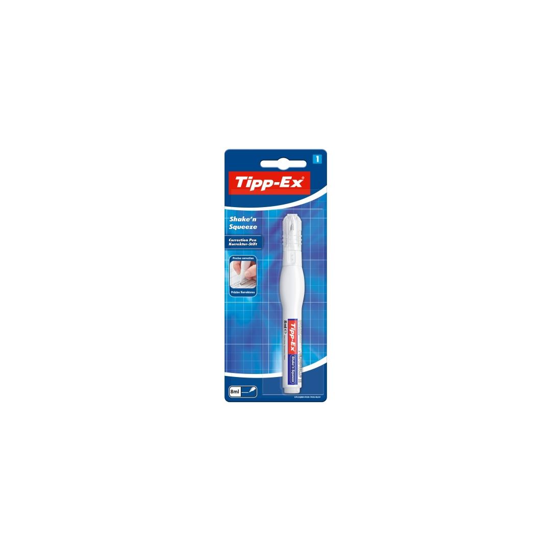 A pack containing 1 Tipp-Ex Shake'n' Squeeze high-performance 8 ml corrector pen with an easy-to-squeeze body for precise flow control. The thin metal tip makes precise correction possible. This high-quality corrector pen offers unbeatable drying speed for instant touch-ups.