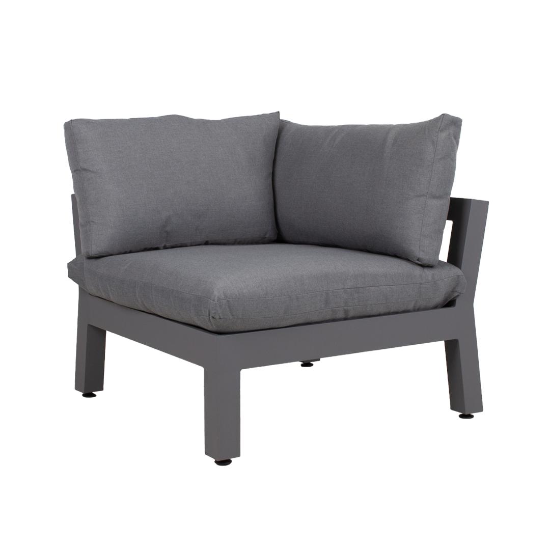 Corner sofa module FLUFFY 93x93xH66cm, gray. A modular sofa is a great way to create a seating area of the right shape and size, which is easy to change and rearrange. The frame of the chair is made of aluminum and finished with gray powder paint. The base of the seat has wide braided straps covered by a 3cm foam mat. Thick and soft cushions and an elastic seat base ensure excellent sitting comfort. The height of the seat to the edge of the frame is 35 cm, including the pillow 51 cm. The dimensions of the seat cushion are 87x87xH16cm, the dimensions of the back cushions are 87x43x18cm, 72x43x16cm. The cushion covers are made of gray polyester fabric. The pillow covers are removable and washable. The product is very durable in changing weather conditions and easy to maintain. Only cushions need protection from the weather. A good solution for daily storage of pillows and keeping them dry is a pillow case. To extend the life of outdoor furniture, we recommend using outdoor furniture covers. STORAGE: At the end of the summer season, we recommend storing the garden furniture indoors. Clean and dry the furniture before storing. Use a dry and well-ventilated room for storage.