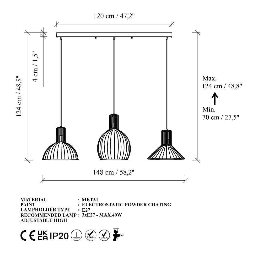 This chandelier features three E27 sockets that can accommodate bulbs up to 40W, allowing you to create the perfect ambiance for any occasion. The adjustable height and cable length make it easy to position the chandelier exactly where you want it, providing ample light and a touch of sophistication.
