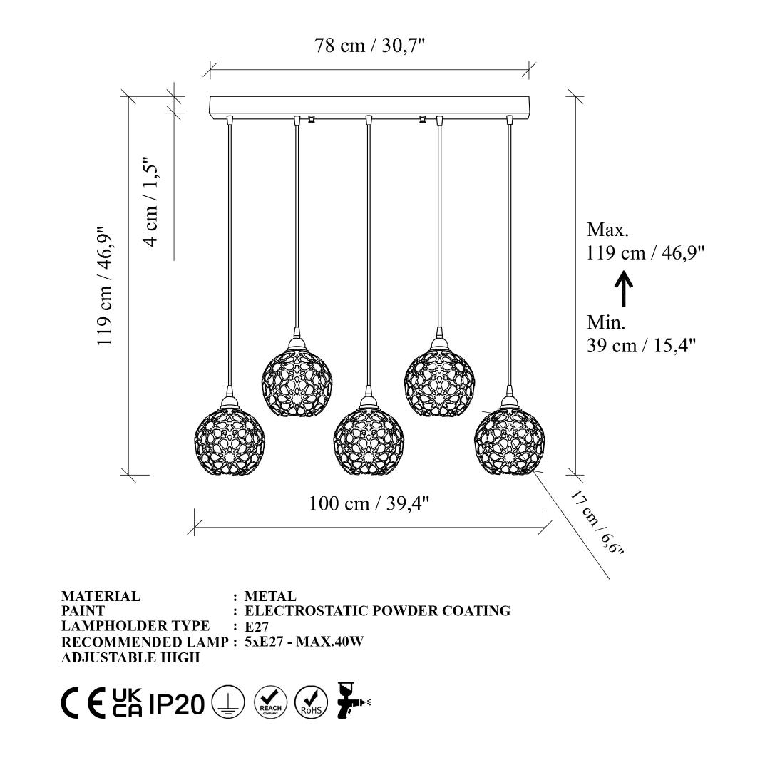 The chandelier features 5 sockets for E27 bulbs, allowing you to choose the perfect lighting for your room. Create a warm and inviting ambiance with soft, dim lighting or brighten up your space with vibrant, energy-efficient bulbs.