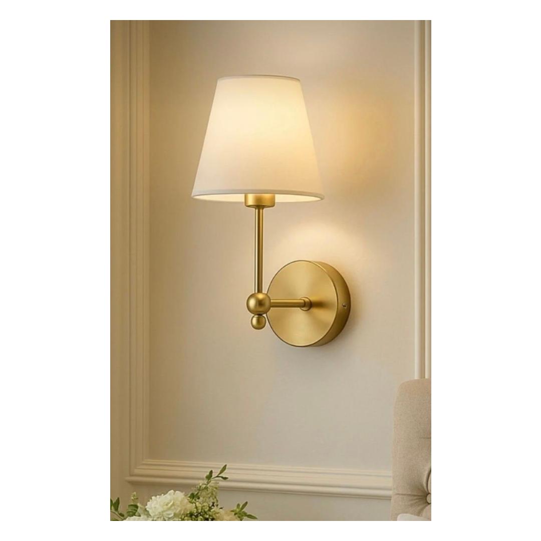 Illuminate your space with elegance and style with our stunning Wall Lamp. This exquisite piece features a sleek metal body and a fabric cap in a beautiful Cream and Gold color combination. The perfect addition to any room, this lamp exudes sophistication and charm.