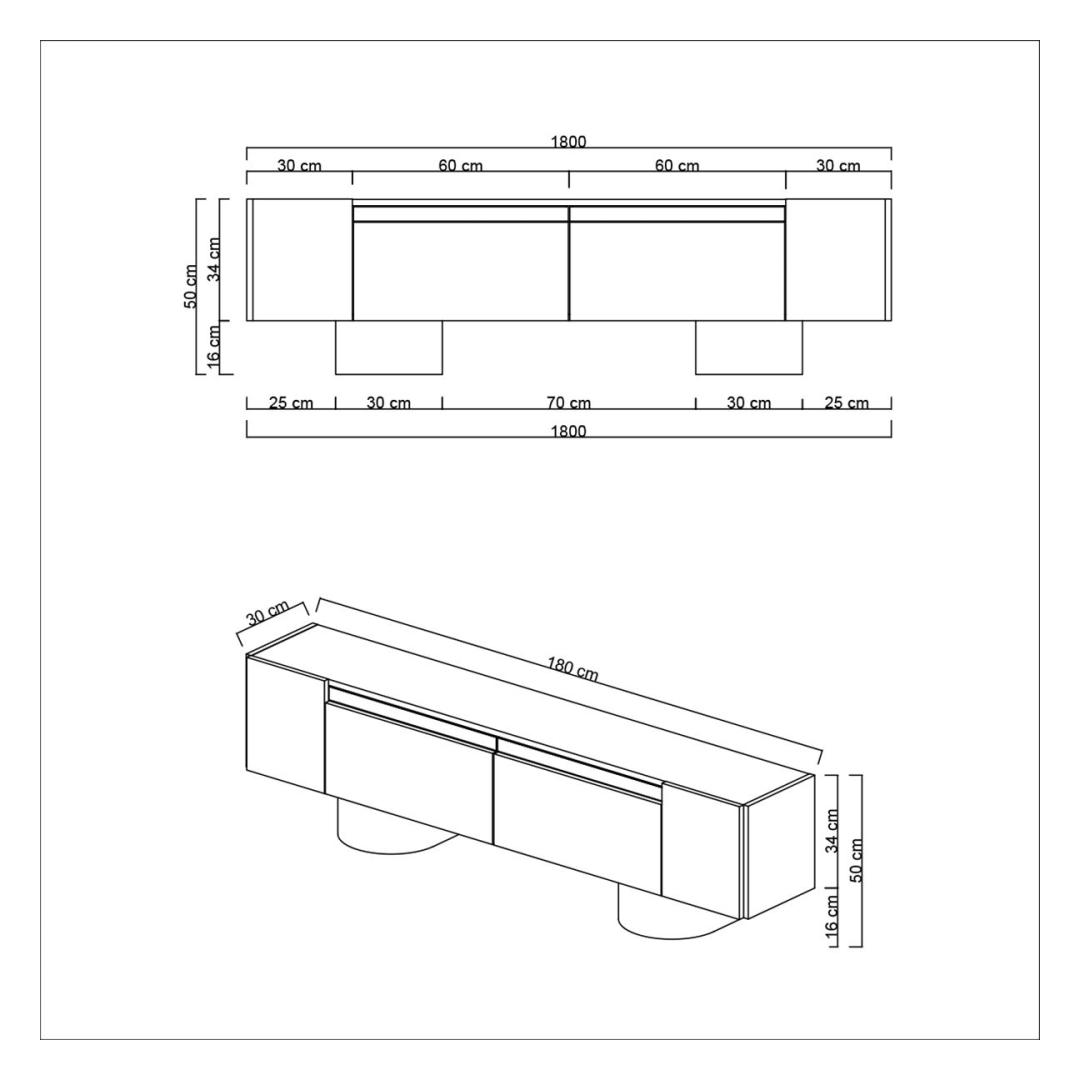 Say goodbye to clutter and disorganization with our TV stand. With a width of 180 cm, height of 50 cm, and depth of 30 cm, this stand provides ample space for your TV, media players, and other entertainment essentials. The 18 mm thickness of the 100% melamine coated particle board ensures durability and longevity, so you can enjoy your TV stand for years to come.