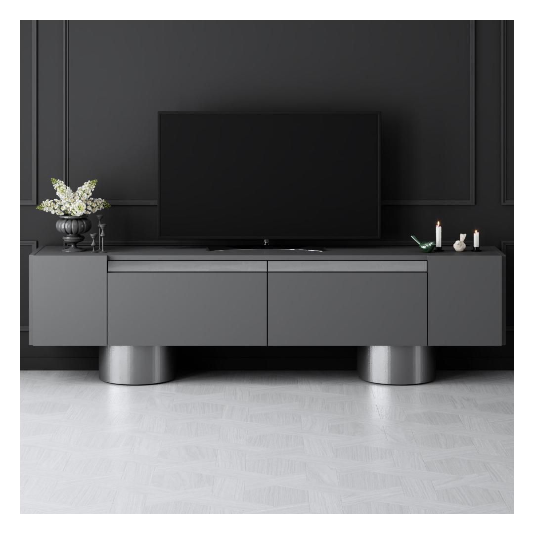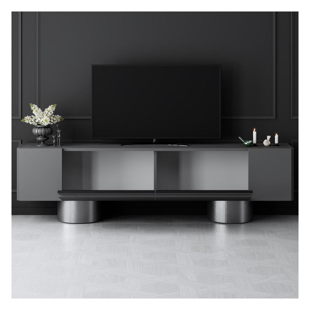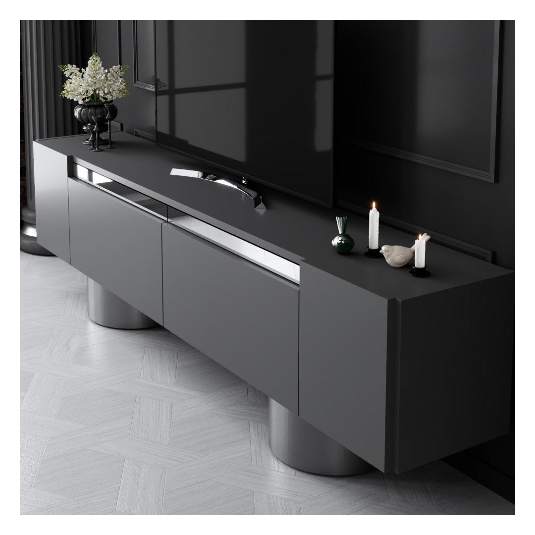 Transform your living room into a stylish and modern space with our sleek TV stand. Made from 100% melamine coated particle board, this stand is not only durable but also incredibly chic. The combination of Anthracite and Silver colors adds a touch of sophistication to any room, making it the perfect addition to your home decor.
